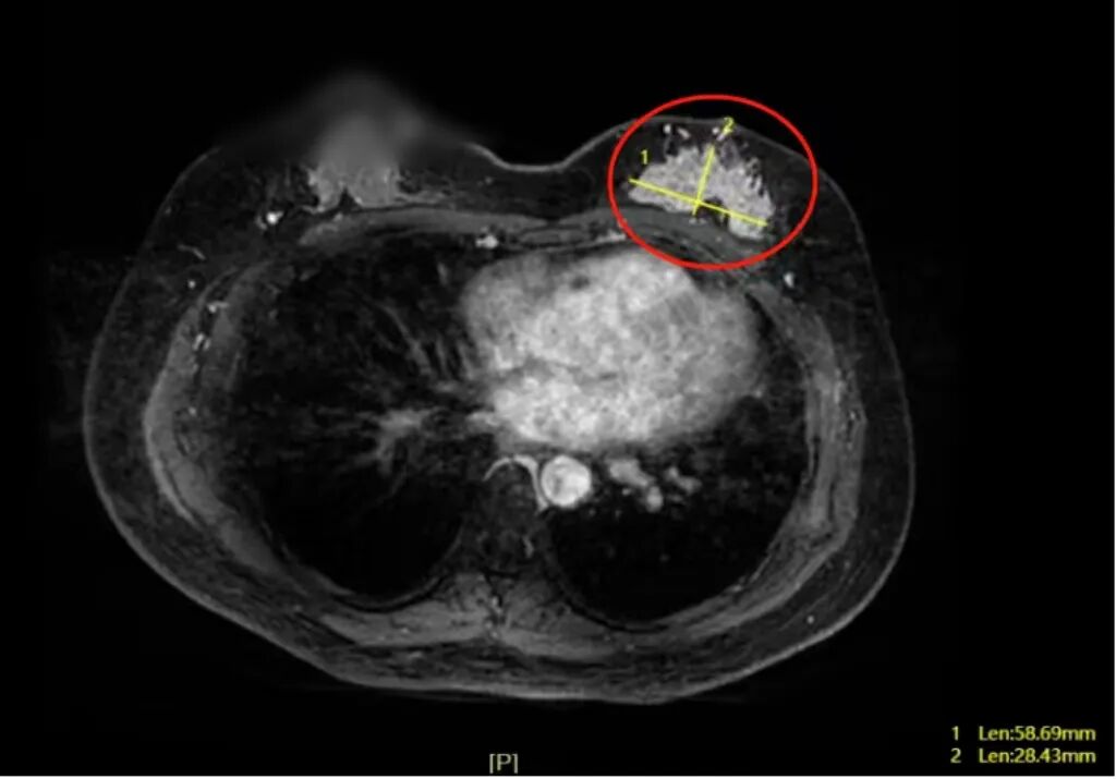 △磁共振检查显示,宋女士的左侧乳房有一个大小约5cm×5cm×2.5cm的肿块