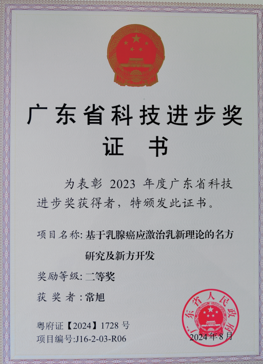 项目名称:基于乳腺癌应激治乳新理论的名方研究及新方开发粤府证[2024]1728号