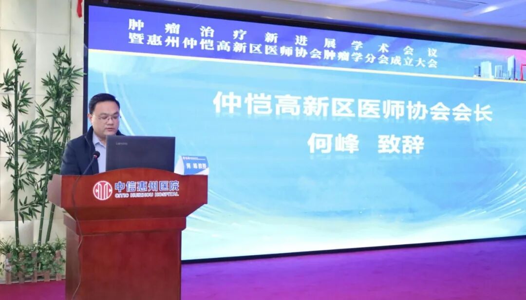 何峰会长代表仲恺高新区医师协会致辞。他表示,惠州仲恺高新区医师协会肿瘤学分会的成立,是区域肿瘤医学发展进程中的一件大事、喜事。当前,恶性肿瘤严重危害群众生命健康,仲恺高新区肿瘤防治工作任务艰巨,该分会的成立既是顺应行业发展需求、回应群众健康期盼的重要举措,也将为区域肿瘤领域同仁搭建优质的学术交流与人才培养平台,推动诊疗资源优化整合与协同创新。针对分会未来发展,何峰会长提出三点期望:打造高水平学术高地,推动前沿诊疗成果落地基层;深化多学科协同协作,构建全周期肿瘤防治体系;坚守医者初心使命,以精湛医术与人文关怀守护群众健康,为健康仲恺建设贡献专业力量。