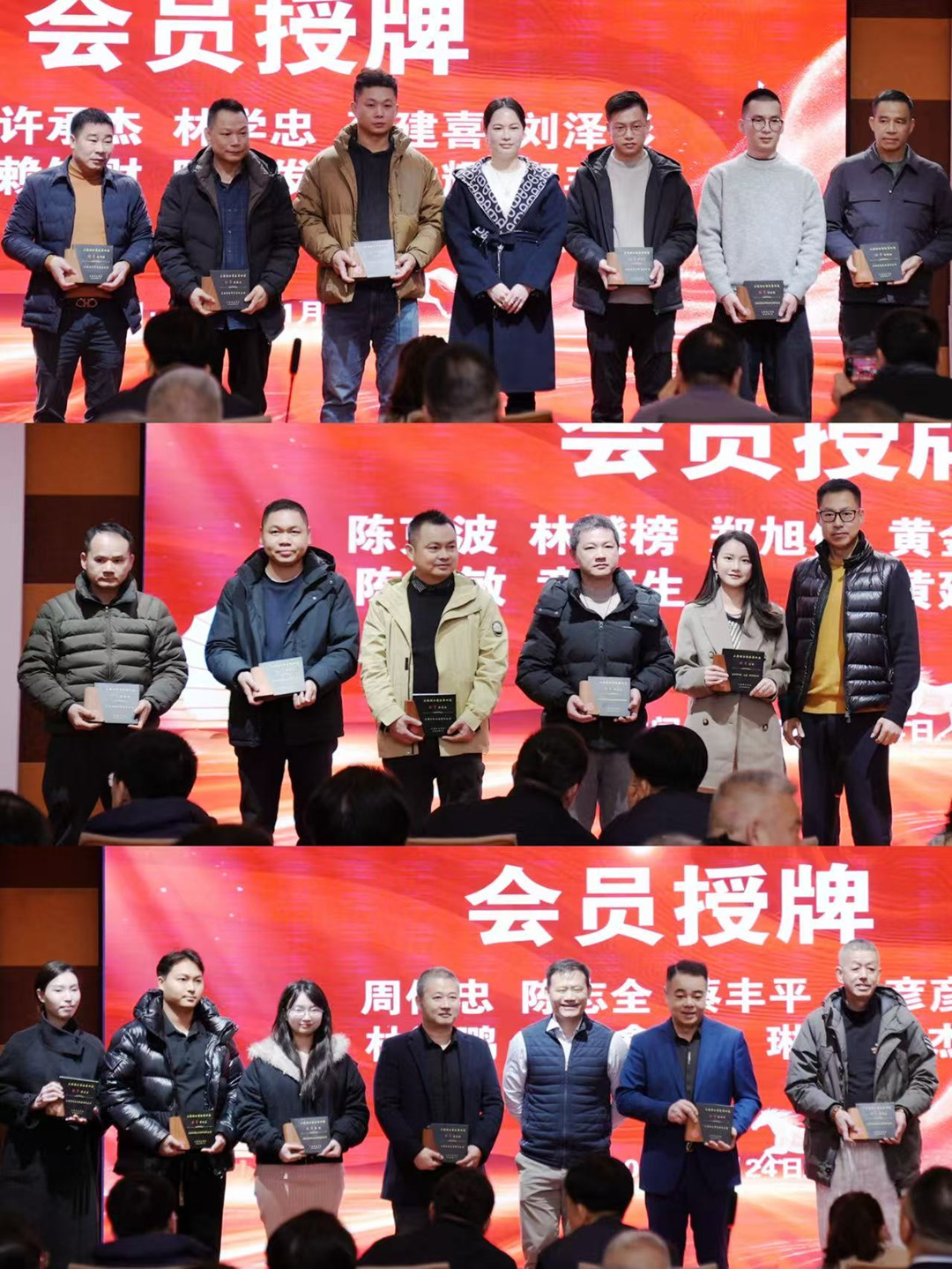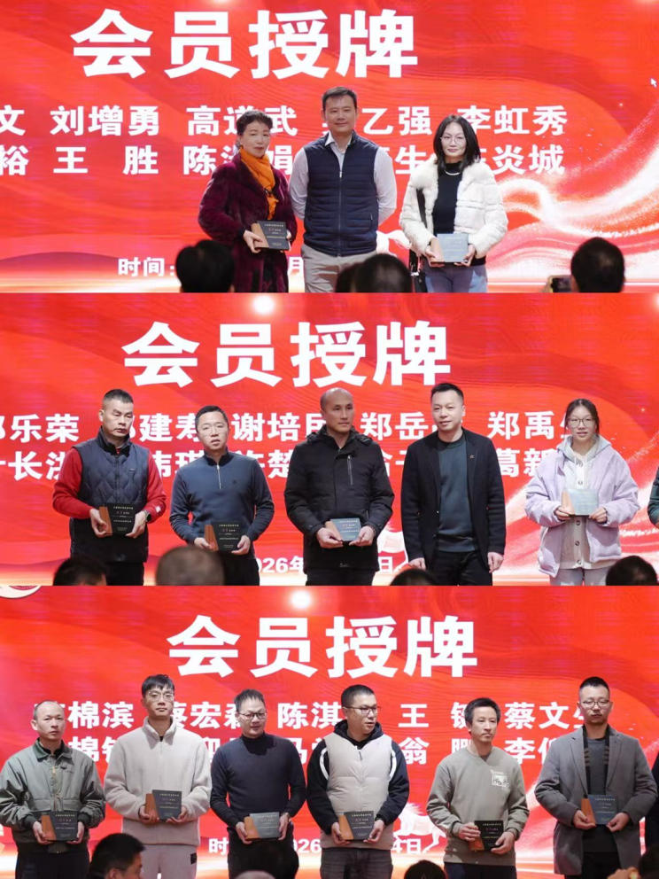 本次活动的重头戏——授牌仪式正式举行。仪式上,依次为会长、支部书记、监事长、执行会长、秘书长、副会长、理事、会员授牌并合影留念。一枚枚牌匾,不仅是荣誉的象征,更是责任的传递,承载着商会对各位成员的认可与期许,也凝聚着全体成员对商会发展的担当与使命。