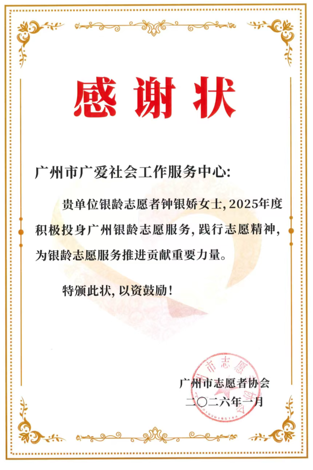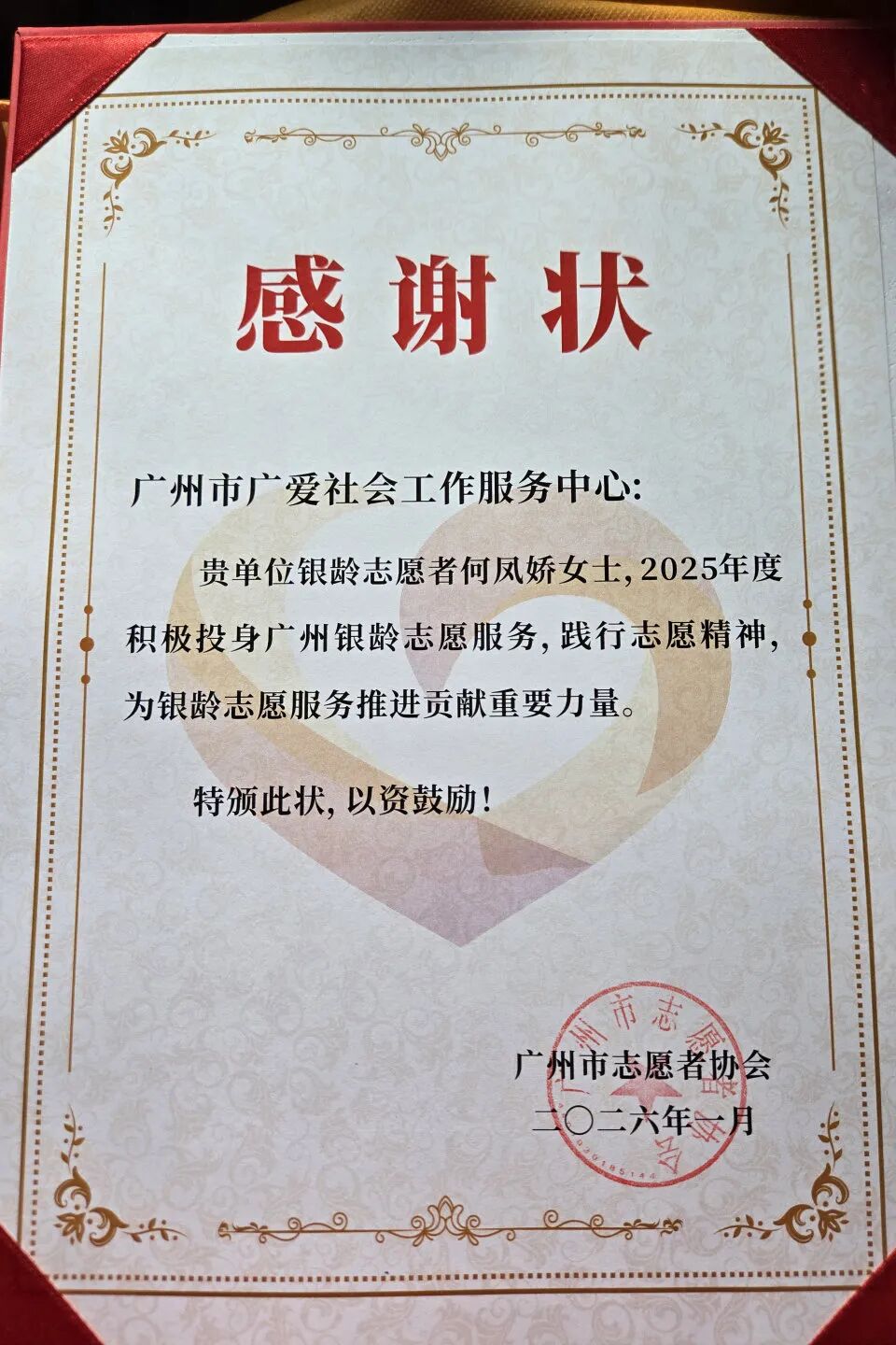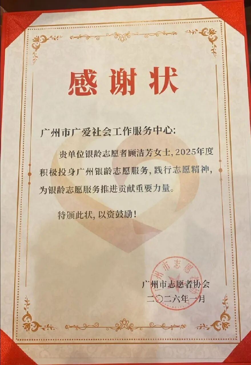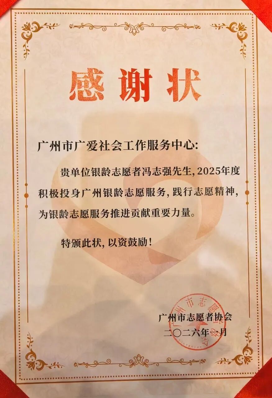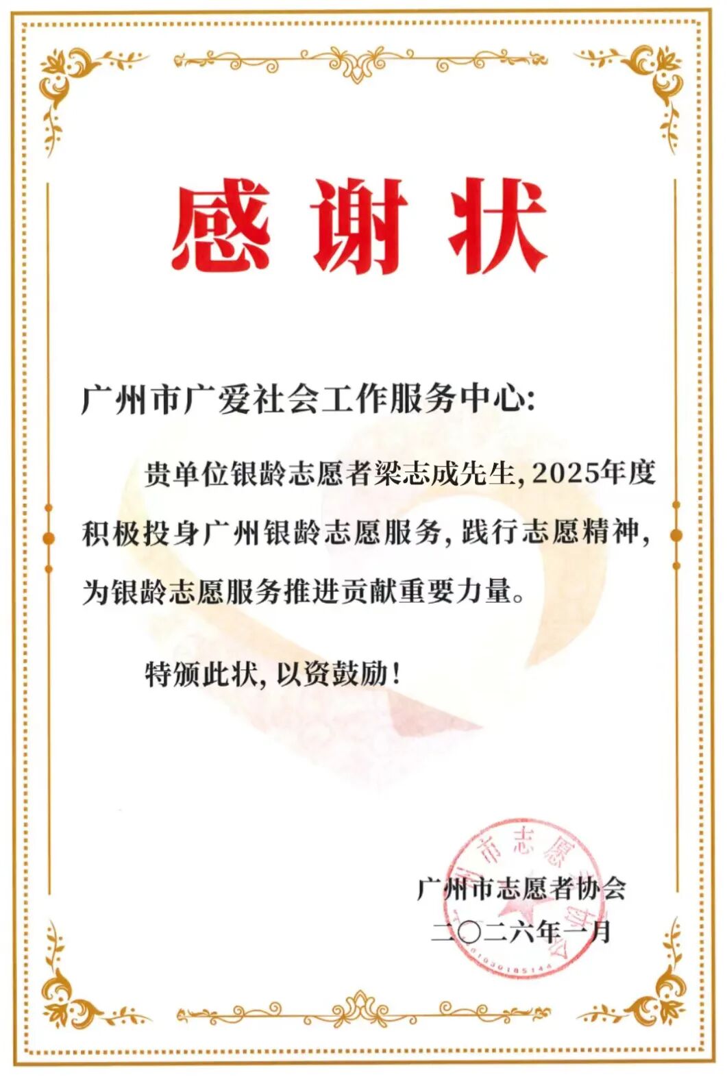 广爱六名银龄志愿者——冯志强、顾洁芳、何凤娇、梁志成、叶君、钟银娇,2025年度积极参与广州银龄志愿服务,践行志愿精神,为银龄志愿服务推进贡献重要力量,“上榜”“2025年度广州银龄志愿者答谢名单”,获颁感谢状。