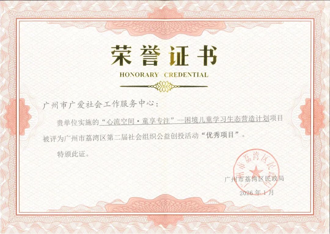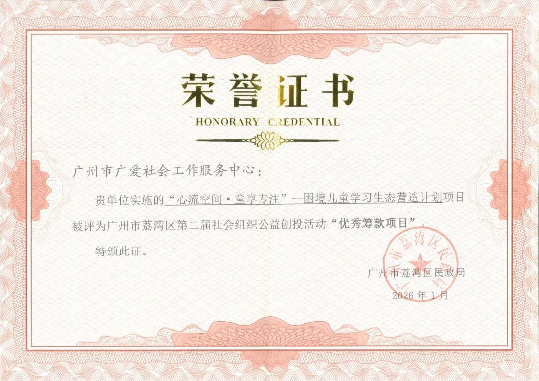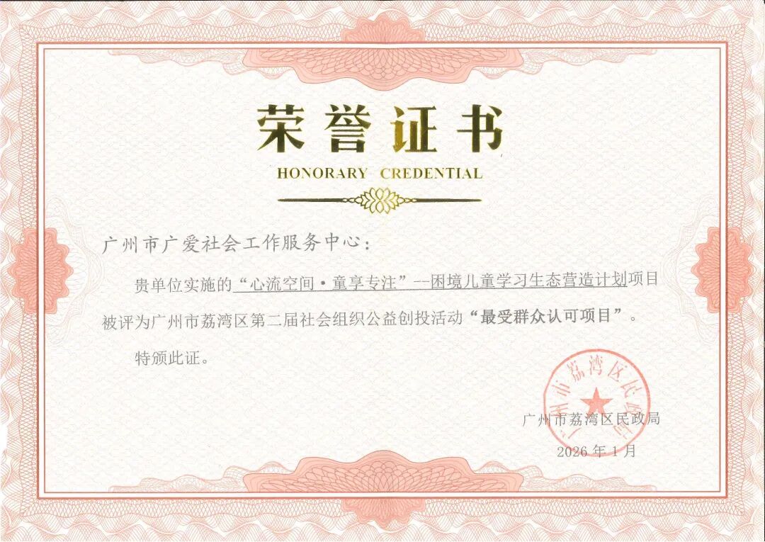 在广州市荔湾区第二届社会组织公益创投活动中,广爱实施的“心流空间·童享专注”——困境儿童学习生态营造计划项目揽获“优秀项目”“最受群众认可项目”“优秀筹款项目”多个奖项。