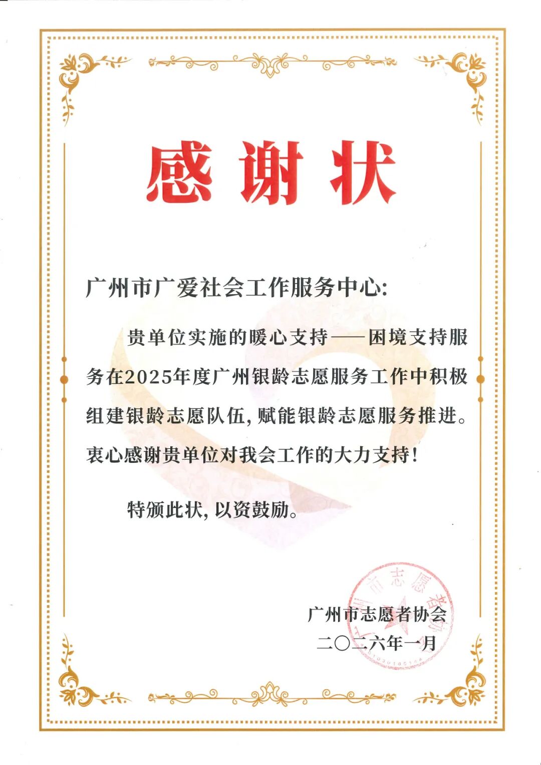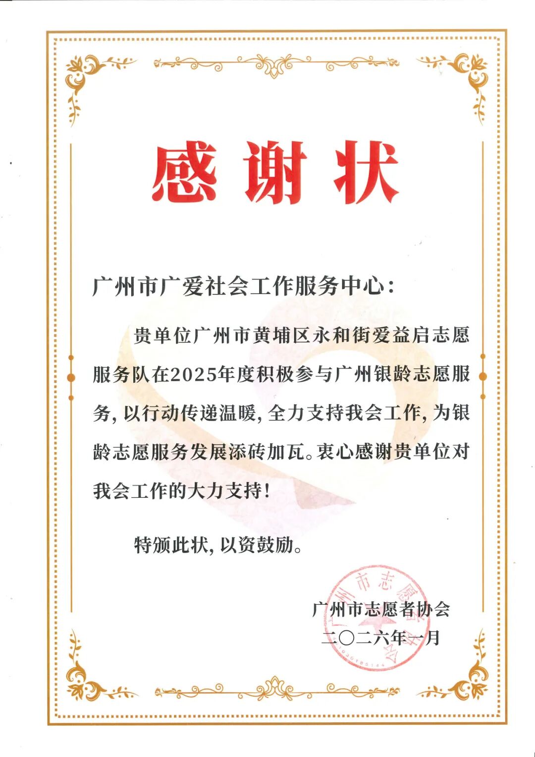 广爱培育的广州市黄埔区永和街爱益启志愿服务队在2025年度积极参与广州银龄志愿服务,以行动传递温暖,为银龄志愿服务发展添砖加瓦,进入“2025年度广州银龄志愿服务队伍答谢名单”,获颁感谢状。