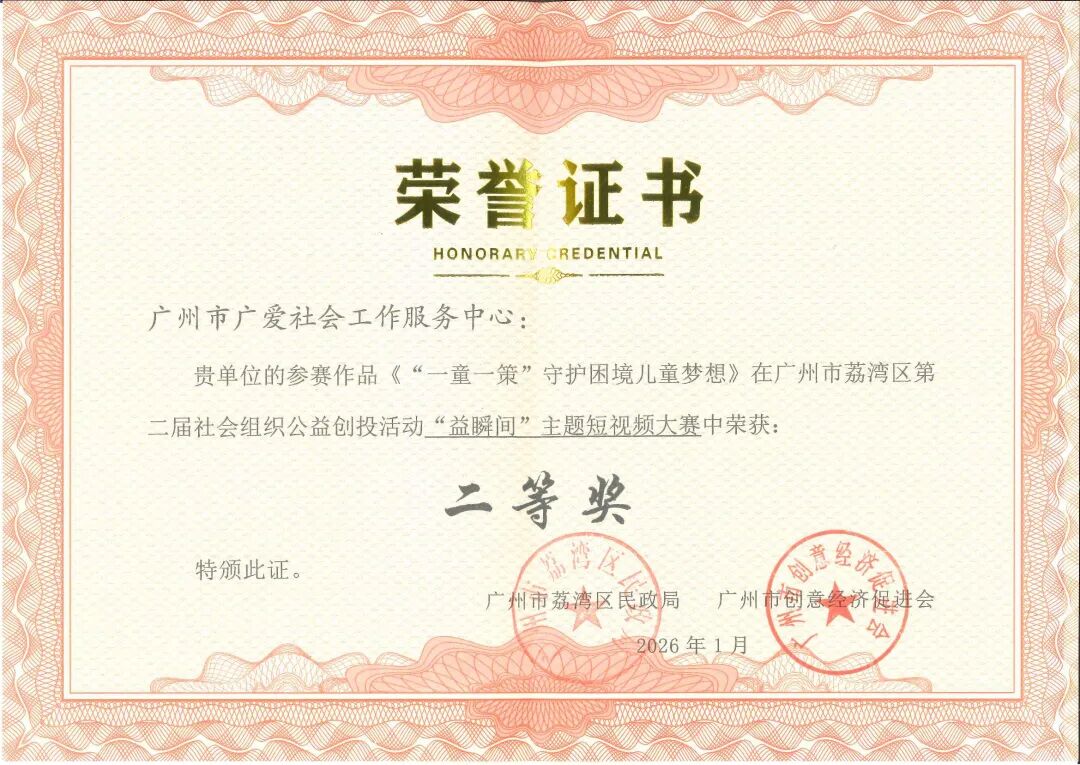 以该项目为背景创作的短视频作品《“一童一策”守护困境儿童梦想》在该活动“益瞬间”主题短视频大赛中荣获“二等奖”。