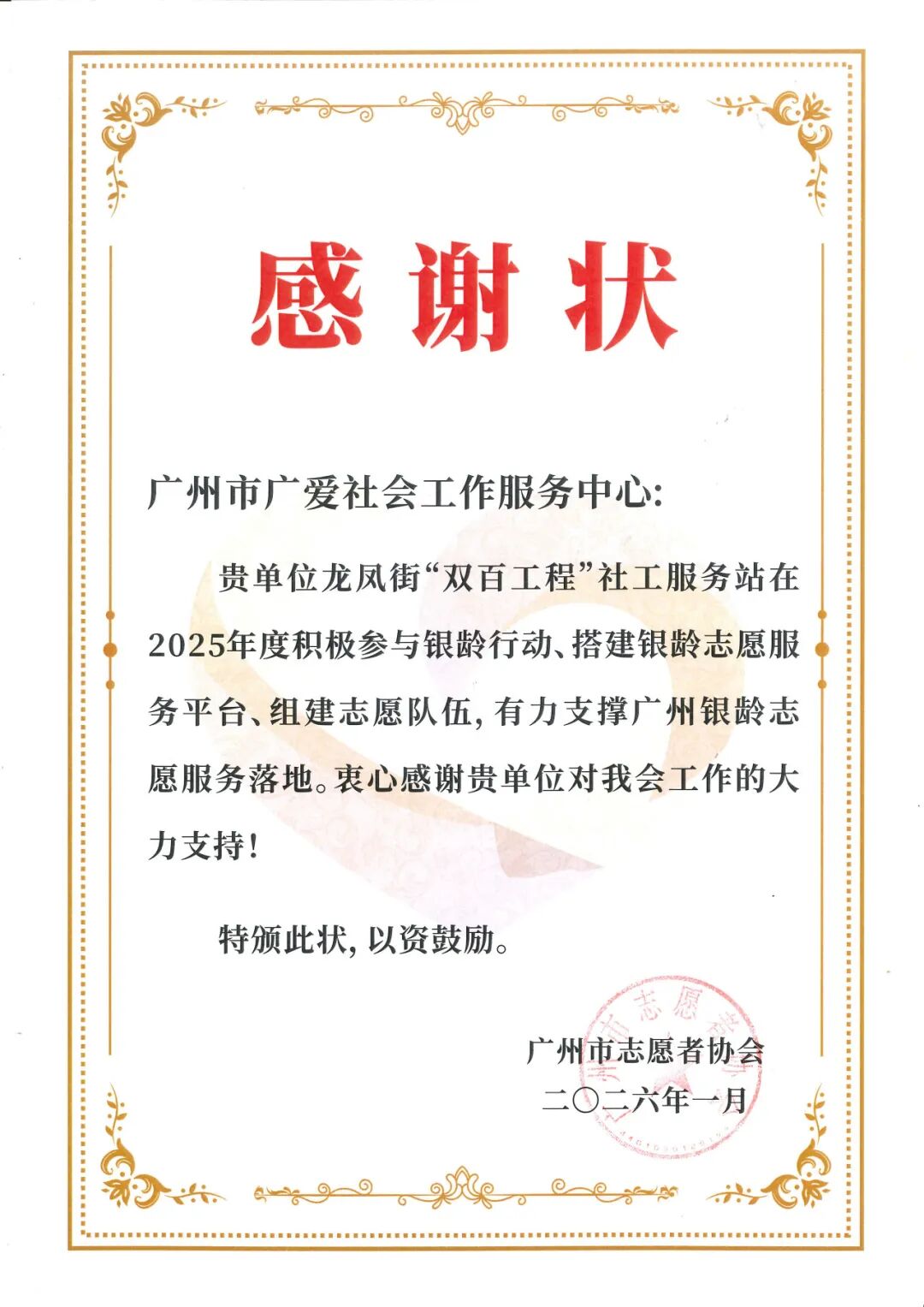广爱承接运营的龙凤街“双百工程”社工服务站在2025年度积极参与银龄行动、搭建银龄志愿服务平台、组建志愿队伍,为广州银龄志愿服务的落地生根提供了坚实支撑,进入“2025年度广州银龄志愿服务站点答谢名单”,获颁感谢状。