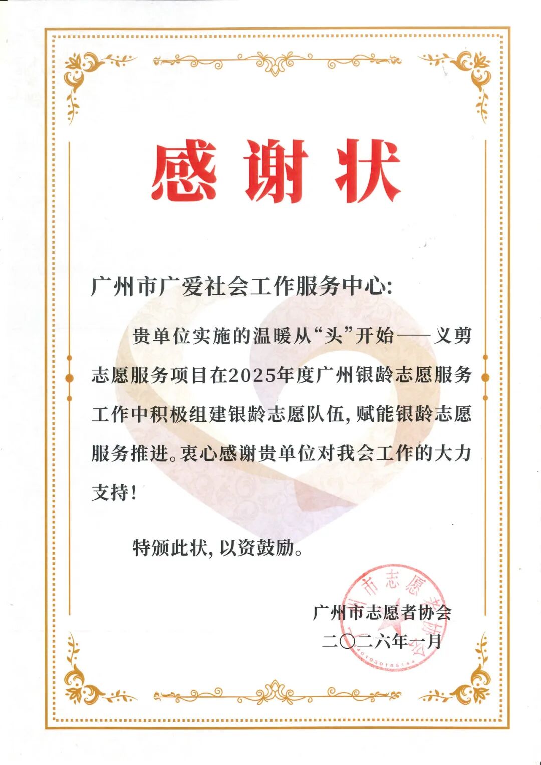 广爱实施的温暖从“头”开始——义剪志愿服务项目、暖心支持——困境支持服务两个项目,在2025年度广州银龄志愿服务工作中积极组建银龄志愿队伍,赋能银龄志愿服务推进,双双进入“2025年度广州银龄志愿服务项目答谢名单”,获颁感谢状。