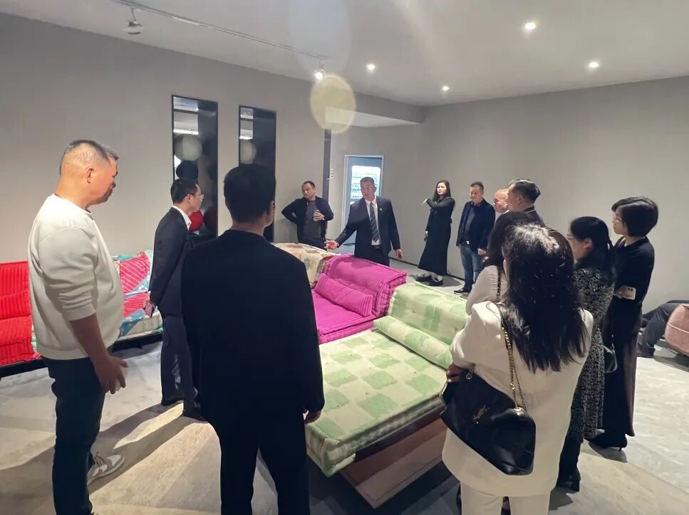 展厅内陈列的现代、极简、美式休闲等多种风格的沙发与软床,不仅展现了精湛的工艺与前沿的设计理念,更让参访成员直观感受到萨玛尼对品质与美学的执着追求。