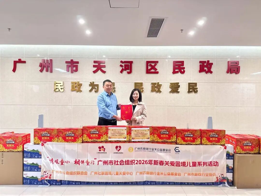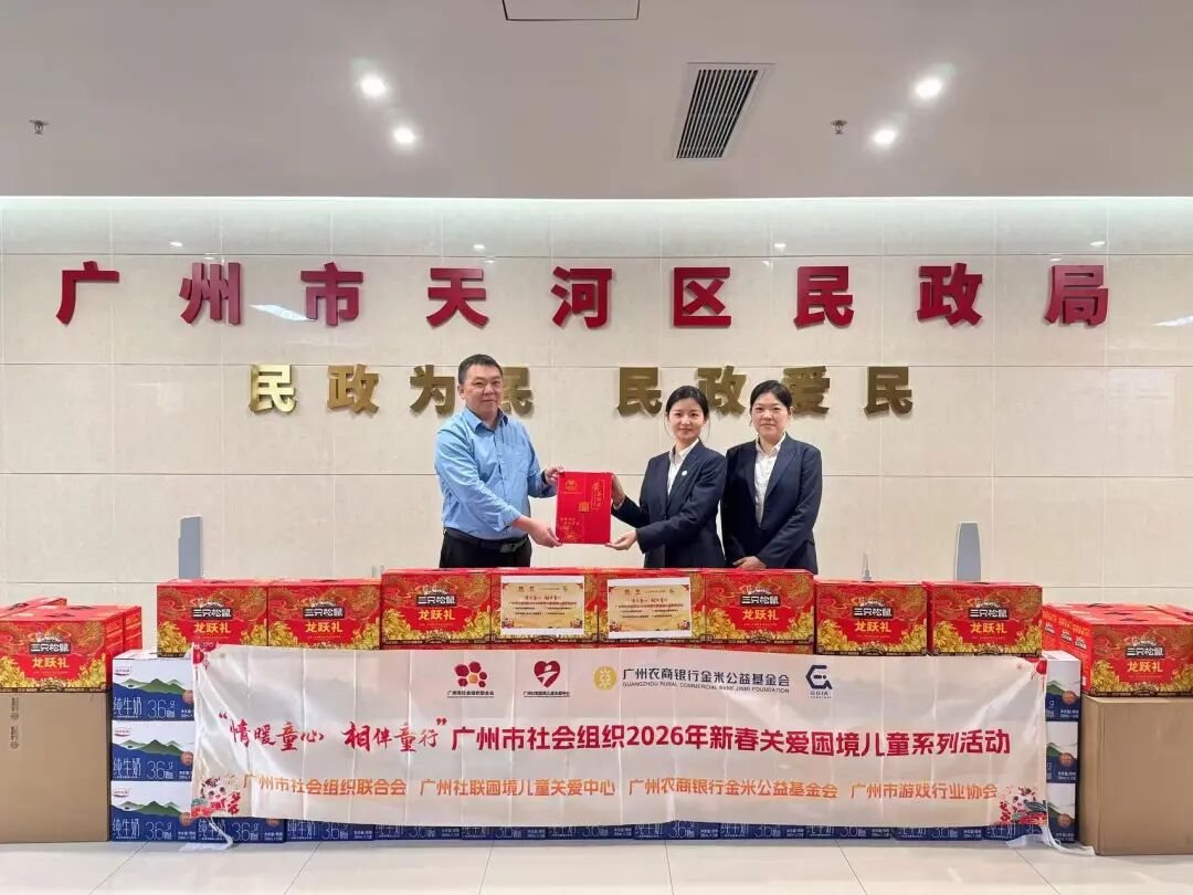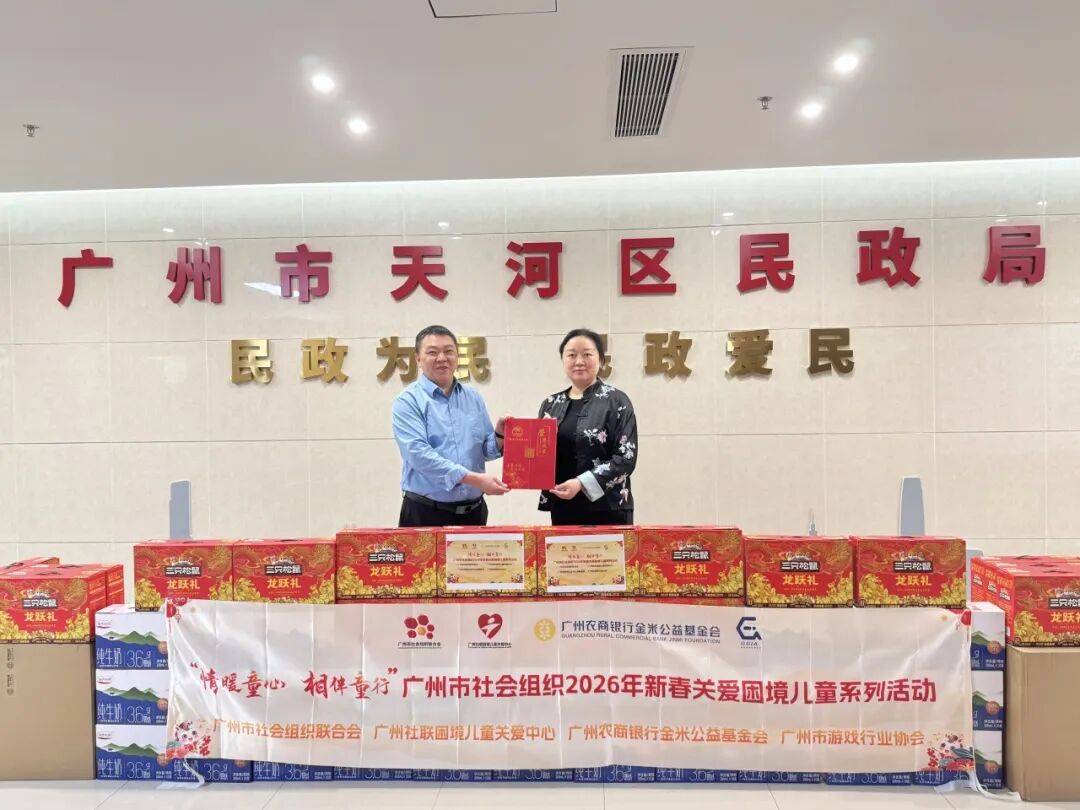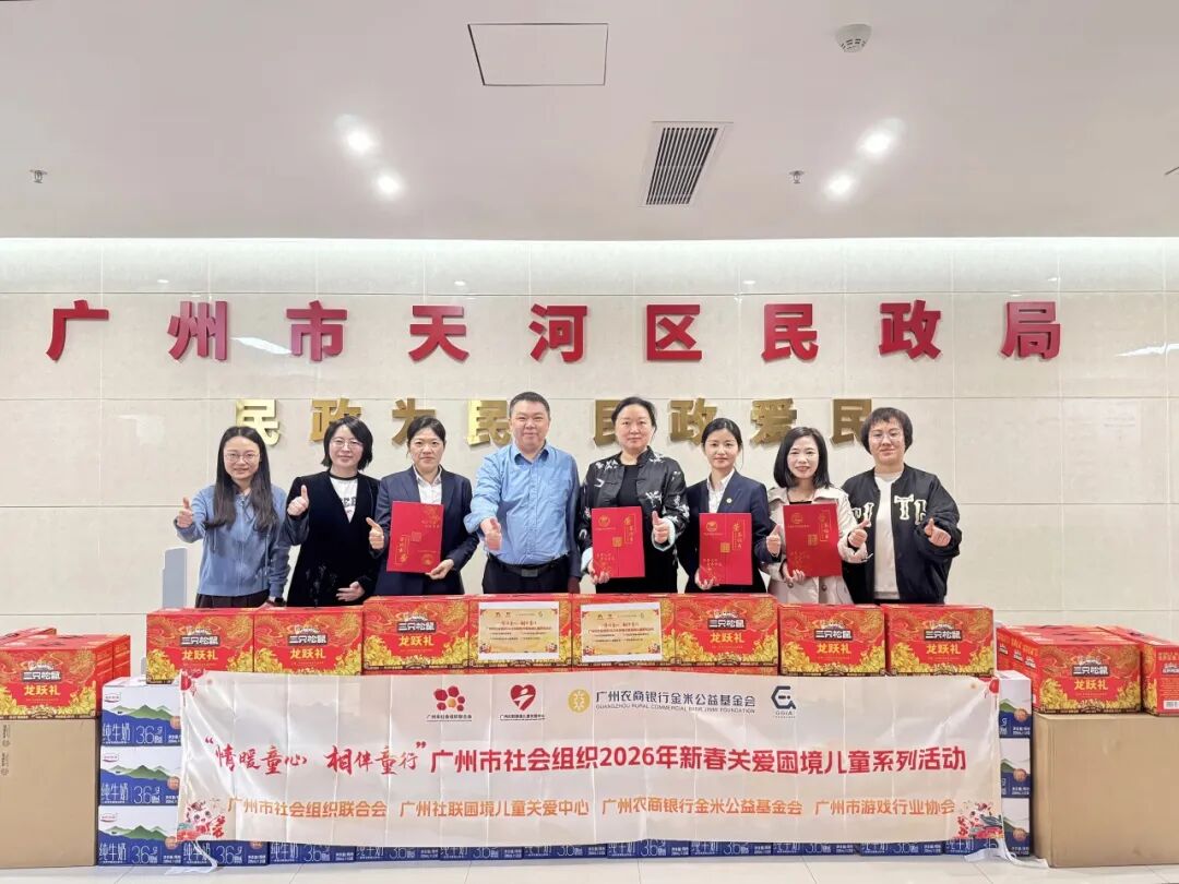 2026年1月27日上午,由广州市社会组织联合会(以下简称“广州社联”)和广州社联困境儿童关爱中心(以下简称“关爱中心”)主办的“情暖童心 相伴童行”广州市社会组织2026年新春关爱困境儿童系列活动走进天河区。活动在天河区民政局举行捐献仪式。广州市天河区民政局党组成员、副局长蒋孝华,广州社联常务副秘书长、关爱中心秘书长庄秀英,广州市游戏行业协会会长王娟,广州农商银行体育东路支行行长朱娜、副行长余纳出席活动。