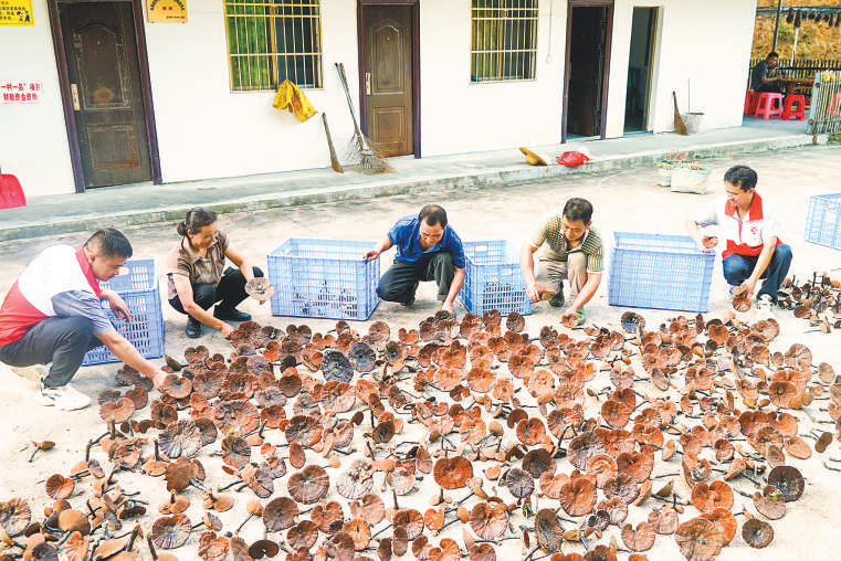 翁源县江尾镇东鹊村邻长曾德勤(右一)和村民一同晾晒刚采摘的灵芝,大力发展林下经济。
