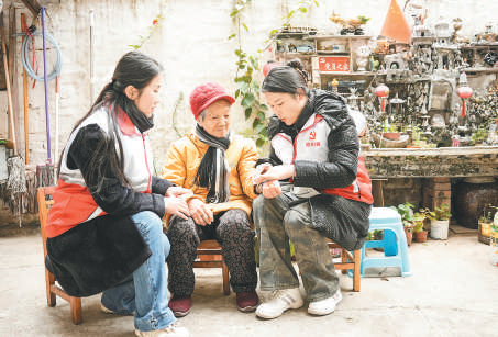 立足关爱留守老人健康,浈江区新韶镇东河村邻长温韶珍(左一)和党员志愿者定期到留守老人家中开展健康体检。