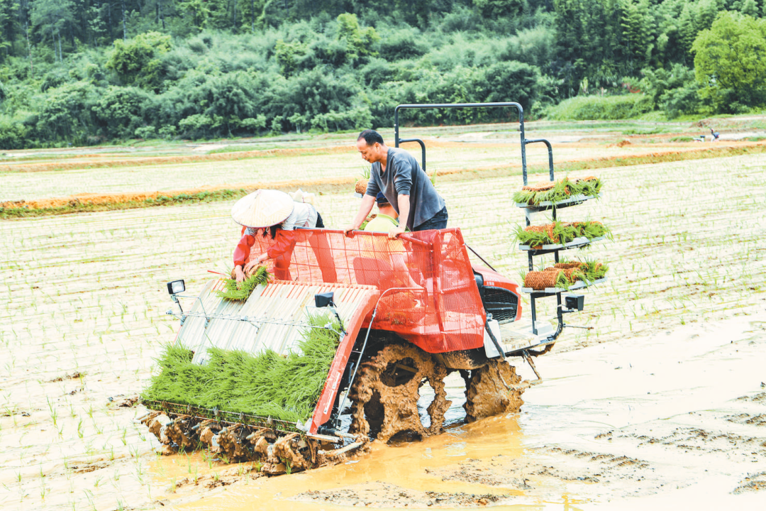 聚力提升农业生产效率,南雄市帽子峰镇坪山村邻长洪成琳(右)在高标准农田现场指导村民水稻机插秧技术。