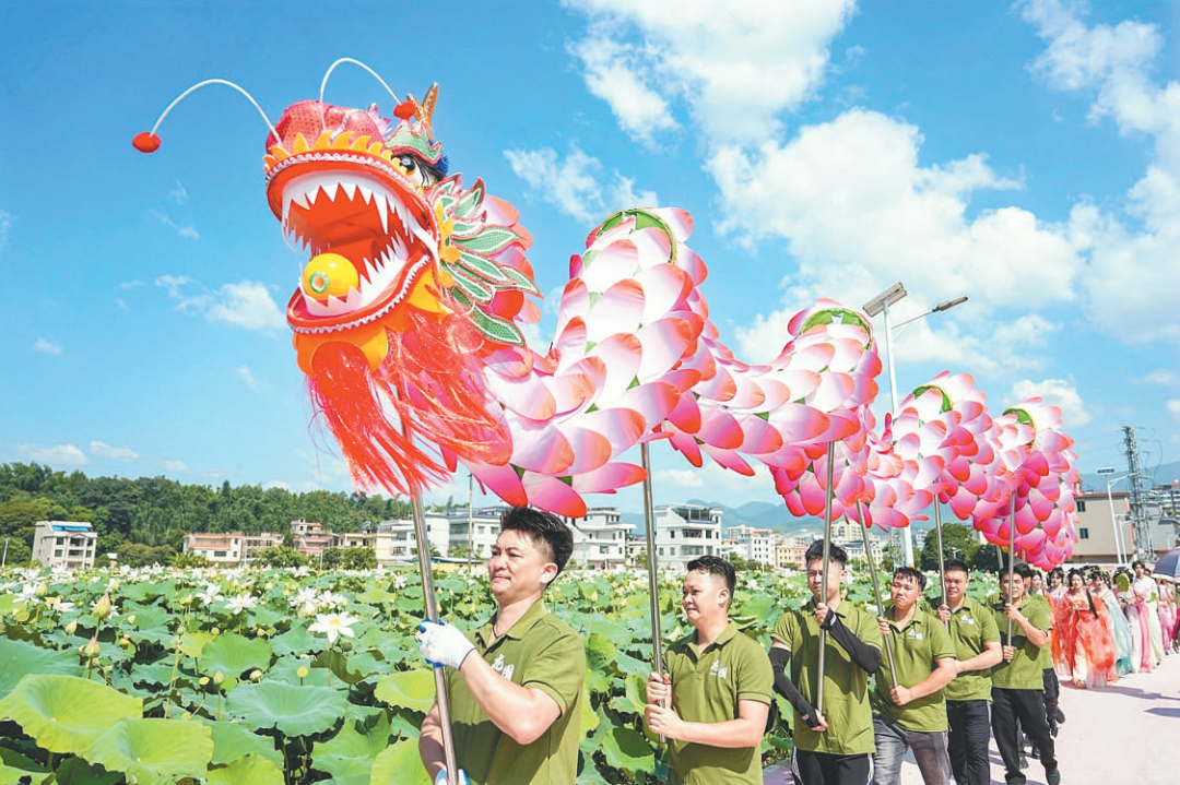 深挖本地资源潜力,新丰县丰城街道龙围村邻长胡斯喜(左一)带头打造“荷花龙非遗项目+特色农业”融合发展模式,为乡村振兴注入活力。