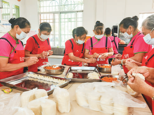为弘扬孝善文化,乳源瑶族自治县乳城镇云门村邻长罗招婷(左一)组织志愿者开展助老服务,定期到长者饭堂为老人提供餐食,满足多元需求。