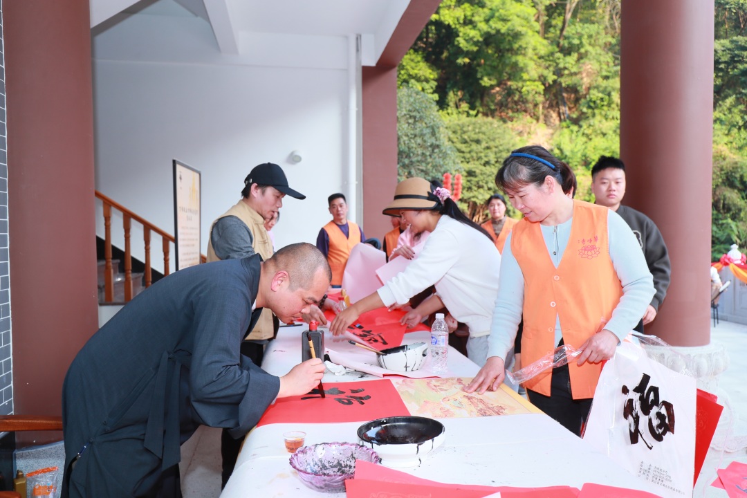 当日,在华峰寺的万佛殿前,各式各样的春联和福字正在展出,还有书法名家现场挥毫,社会各界人士前来参与展览,中国红的春联与华峰寺的清幽雅致相得益彰,新春佳节的氛围被春联展烘托得尤为浓厚。