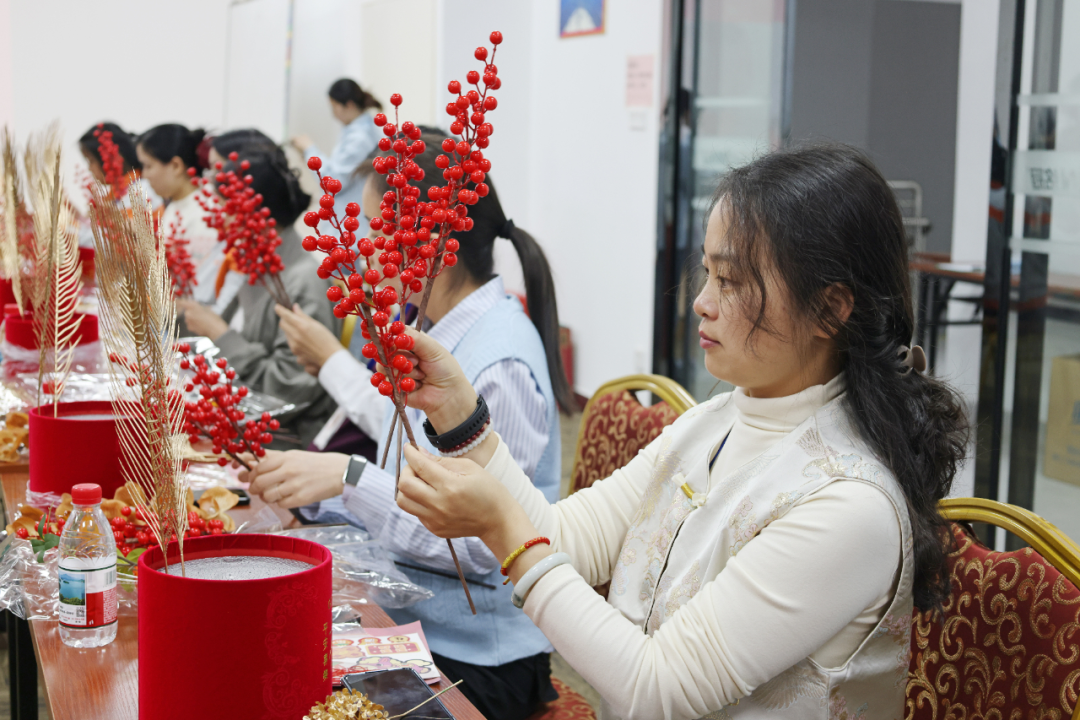 随后,专业美育老师逐步讲解福桶制作技巧与配色原则,指导职工们以红色桶身为基,精心搭配银柳、冬青等吉祥花材,再点缀以贺年挂饰、福字与小灯笼。大家手指翻飞,细心调整每枝花材的角度与装饰的位置,在互动协作中创作出一个个红火饱满、独具巧思的新春福桶,现场仿佛绽开一片喜庆洋洋的“年味花园”。