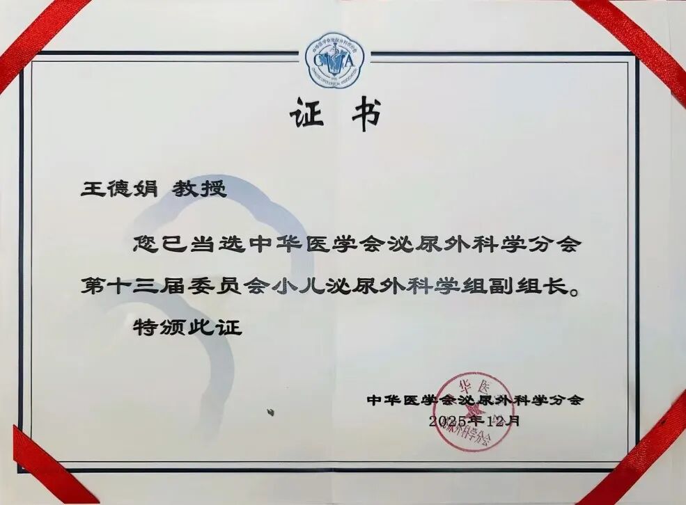 王德娟副组长表示,当选中华医学会泌尿外科学分会第十三届委员会小儿泌尿外科学组副组长,深感责任重大、使命光荣。未来她将积极履行职责,充分发挥学组平台优势,加强与全国同道间的学术交流与科研合作,推动小儿泌尿外科微创技术与诊疗规范的推广应用,为提升我国儿童泌尿系统疾病的诊治水平贡献力量。