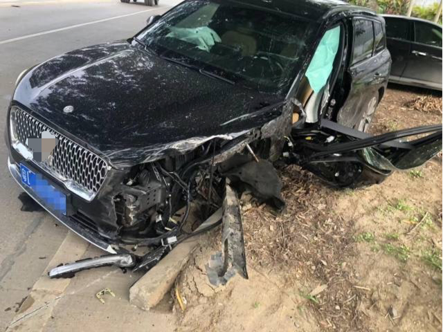 在惠州博罗县,一辆小车与对向行驶的重型货车发生碰撞,碰撞后小车车尾撞上树干,车头已完全变形,机油渗漏至地面,双闪灯还在不停闪烁。由于驾驶人及乘客都系了安全带,车上人员并无大碍。