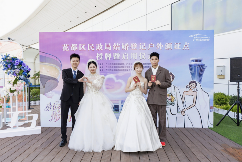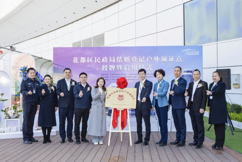 1月28日上午,广州市花都区民政局与广州白云国际机场股份有限公司携手共建的结婚登记户外颁证点授牌仪式在白云机场T3航站楼观景平台举行。