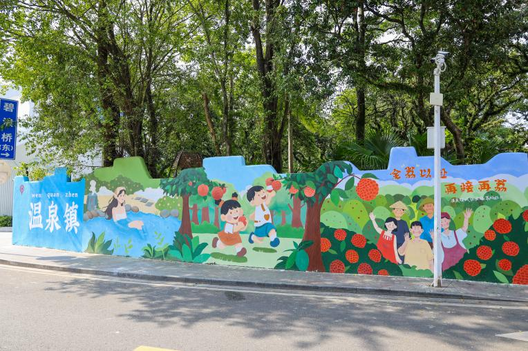 温泉镇温泉社区则积极搭建结对共建平台,与圣托利温泉庄园、城郊骏豪机电公司等企业建立合作,争取民生微实事专项资金支持,形成多元资金和物资保障。同时,联动广州南方学院“三下乡”志愿队伍,充分发挥青年学子的创意优势,绘制了4幅涵盖本土文化和温泉元素的主题墙绘,将社区核心地段的“黑旧墙”焕新升级为兼具观赏性与教育意义的“打卡点”“风景墙”。