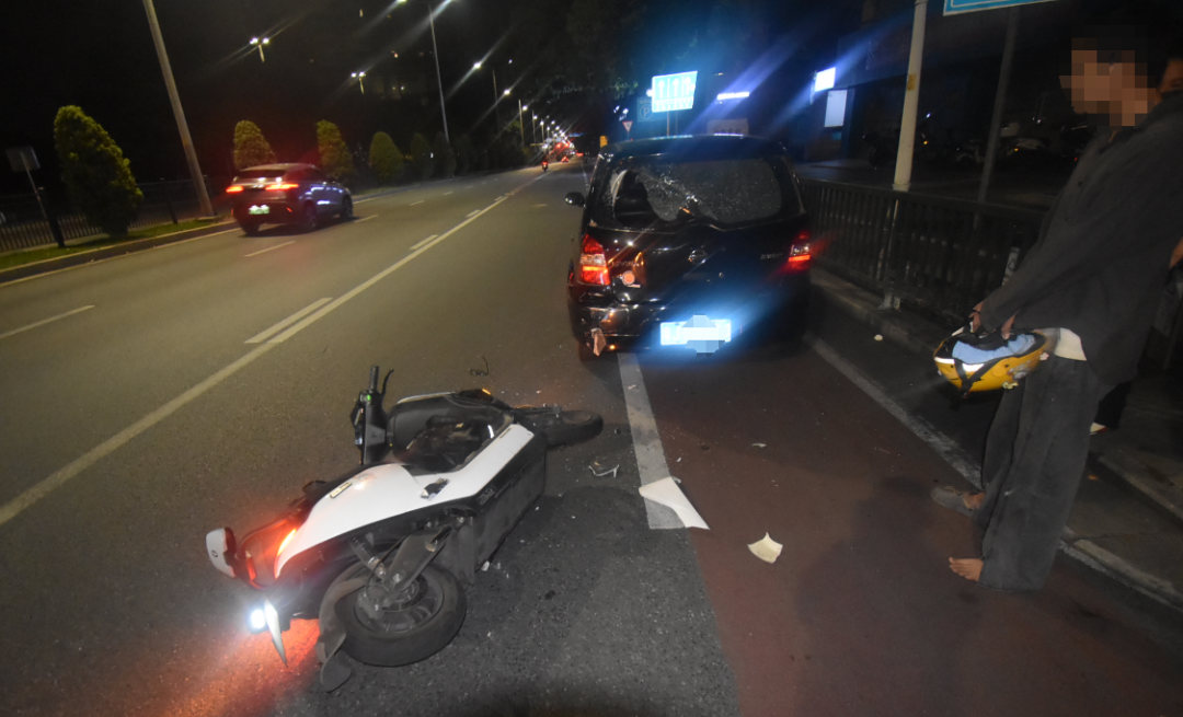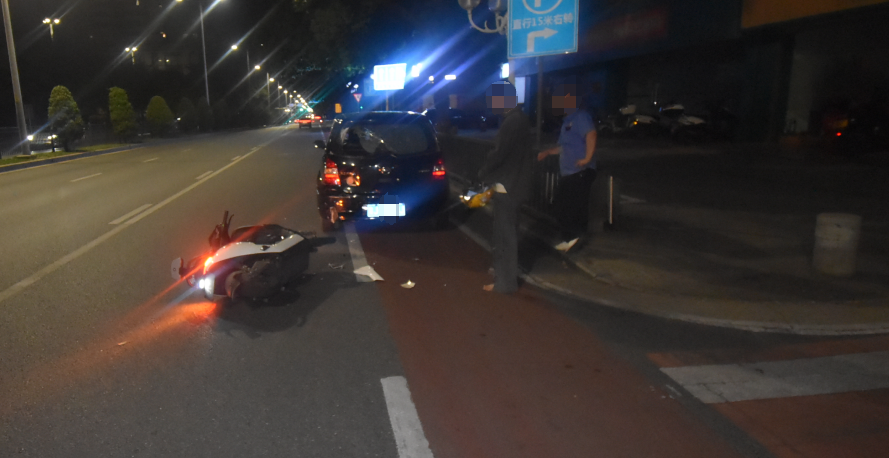 4月22日凌晨,徐某驾驶无号牌普通二轮摩托车行至江门某路段时,因一时分心撞上前方违规停靠在非机动车道上的黑色小车。事故造成徐某受伤及两车不同程度损坏。