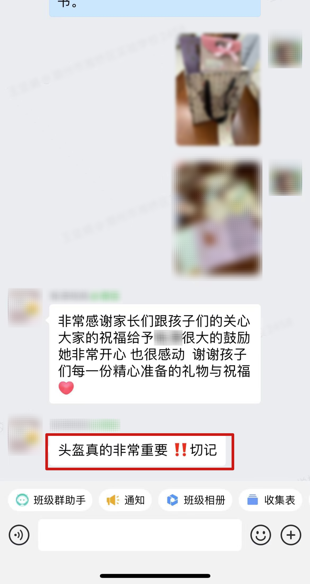 ▲事后,学生家长在班级群里向大家强调佩戴头盔的重要性