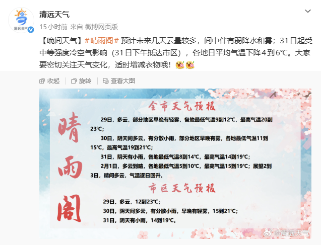 广东省气象台预计,1月29日—30日,广东云量逐渐增多,部分市县早晚能见度下降,并伴有分散性的弱降水。1月31日,新一股中等强度冷空气开始进入广东中北部,中北部和粤东市县有小雨。