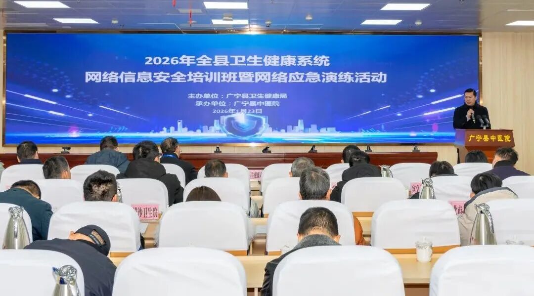 为全面强化广宁县卫健领域网络信息安全保障能力,近日,广宁县卫生健康局举办“2026年全县卫生健康系统网络信息安全培训班暨网络应急演练活动”。本次活动由广宁县中医院承办,旨在深入贯彻《中华人民共和国网络安全法》,落实网络安全工作责任制,提升全县医疗卫生机构应对网络信息安全事件的应急处置与实战防护水平。县卫生健康局、县政务和数据局、县公安局网安大队以及全县公立医疗机构约100人参与本次活动。