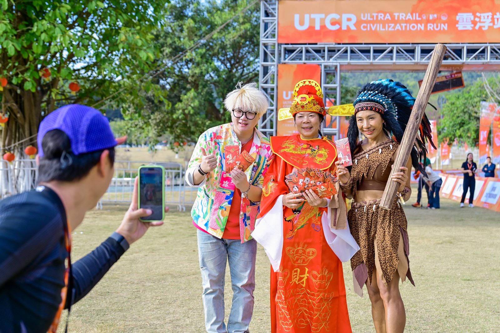 赛道上,跑者们奋力前行。他们攀上山坡,踏过土路,呼吸急促而有力,有参赛者特意穿着仿兽皮材质的服饰,脸上绘有原始纹样,在奔跑中仿佛与这片古老的土地进行着直接的对话。赛事设置了石智50KM、火光30KM、与共10KM亲子组三个组别。在与共10KM儿童组中夺得第一名的15岁男生欧戈弋兴奋地分享:“今天心情非常好,拿到了第一名!大王山里面很漂亮,跑得很舒服,路非常美,风景非常美。”