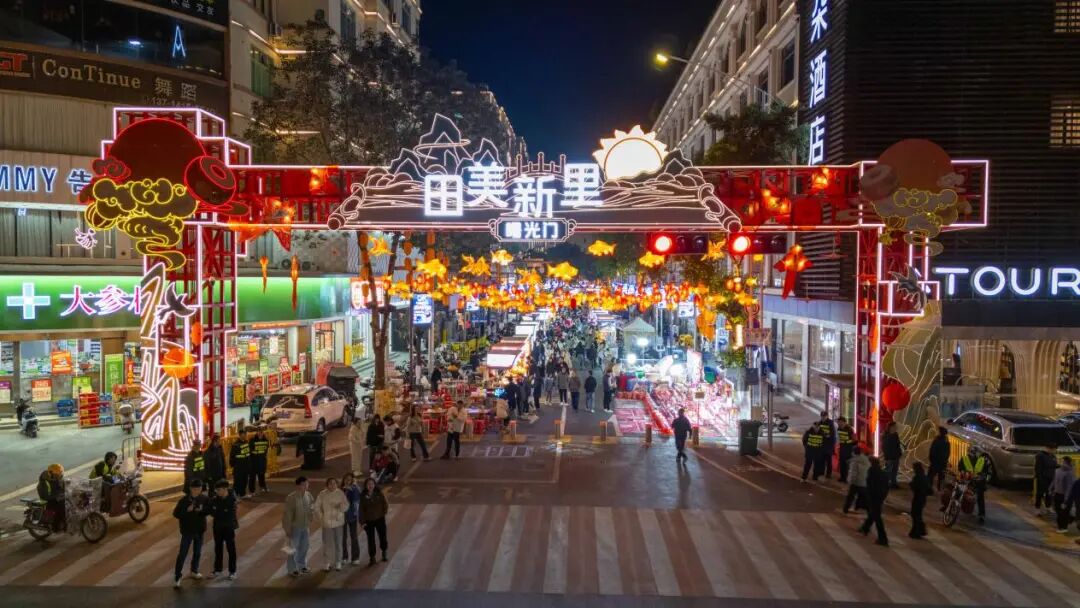 田美村历史悠久,区域内3座祠堂、1座北帝庙特色鲜明。在改造过程中,坚持以历史为序,凸显岭南风格与新华特色,避免“千市一面”“千村一面”的同质化问题。通过建设多个特色“夜市门楼”、美食橱窗,布设LED屏幕、灯光、置景、多媒体,增设沿街建筑轮廓灯,营造出沉浸式体验氛围。同时,优化慢行交通,提升雨污分流、燃气、水电等陈旧老化设施,形成体验更加完善的消费联动区,实现从“破乱”到“焕新”的华丽蝶变,其中,天然气接入到夜市个体摊贩为全国首例。未来,项目还将统筹利用夜市周边学校地下空间,配建地下停车场、立体停车场,并通过空中连廊等公共空间串联周边商业节点,构筑“高颜值”复合型夜间消费场所。