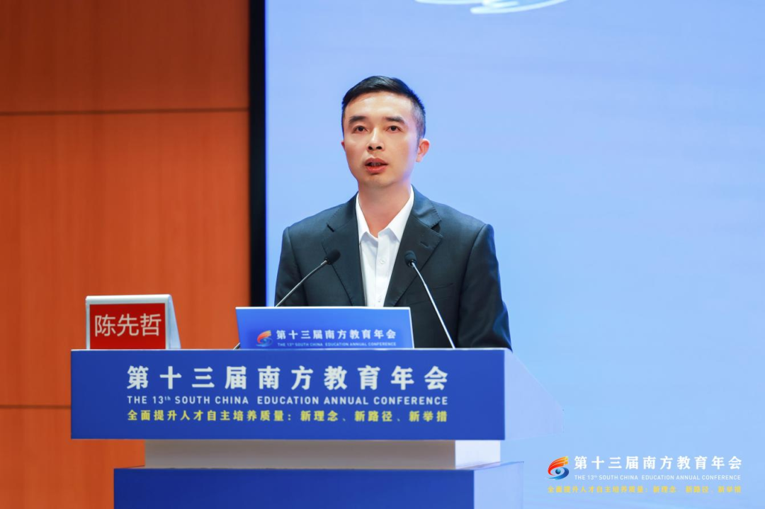 在第十三届南方教育年会上,华南师范大学教育科学学院高等教育研究所所长陈先哲教授作主题演讲《以开放式创新理念引领人才自主培养质量提升——新型研究型大学的崛起与使命》。