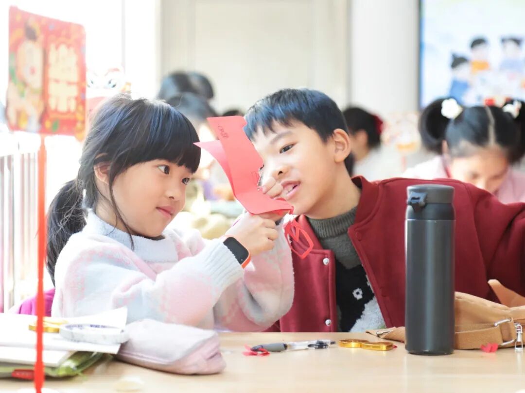 在传统民俗手工课上,孩子们跟着老师的示范,认真折叠、裁剪,指尖翻飞间,一张张普通的纸渐渐变成了精致的手工作品,课堂上不时传来阵阵欢呼与赞叹,暖意满满。