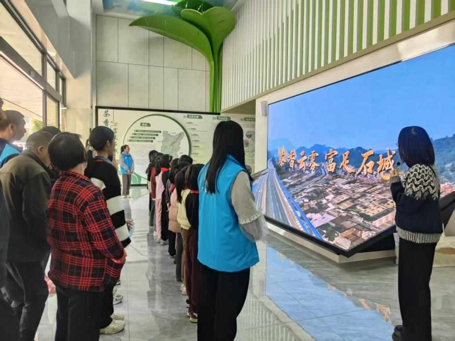 在讲解员引导下,同学们依次参观各功能展区。通过专题视频、趣味讲解和实物陈列的方式,大家系统了解了石城镇在“百千万工程”中的发展脉络与建设成效。展区内,纹路精美的石雕、造型雅致的工艺品在灯光下熠熠生辉,生动展现了本土石材产业从传统加工向“创意+展览+销售”模式的转型升级之路;托洞腐竹、迳心茶、擂茶粥膏等本地特产琳琅满目,更有以石材精心雕琢而成的茶洞豆腐、擂茶粥、艾糍等特色菜肴,造型惟妙惟肖,全方位彰显了家乡深厚的美食文化底蕴,让同学们深刻领略到家乡产业的创新活力与人文魅力。在功能空间体验环节,同学们走进公益书吧、党建活动室等区域,明亮舒适的环境与丰富齐全的配套配套设施让学生们驻足流连,纷纷相约假期结伴再来打卡。