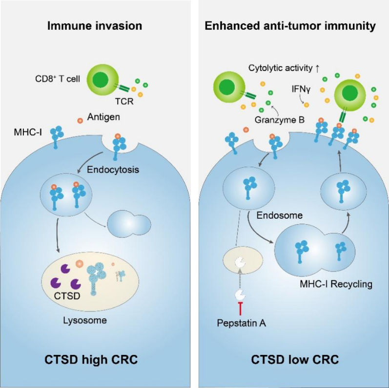 该研究揭示了CTSD可直接与MHC-I分子结合,促使MHC-I分子通过溶酶体途径降解,发挥免疫逃逸的新机制,探索了靶向CTSD提高肿瘤免疫疗效的新策略,为结直肠癌免疫治疗提供了新思路。