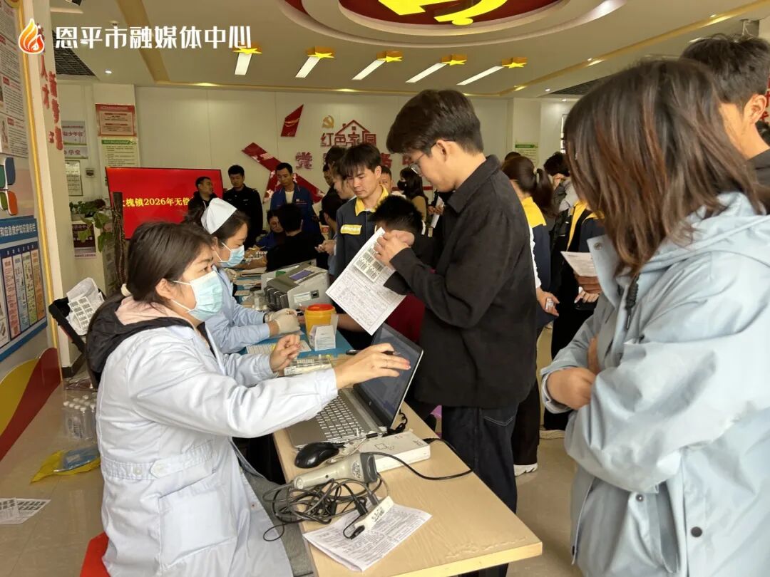 为切实保障春节前后临床医疗用血供应,近日,恩平市红十字会联合大槐镇在镇党群服务中心举办2026年恩平市首场大型团体无偿献血活动。