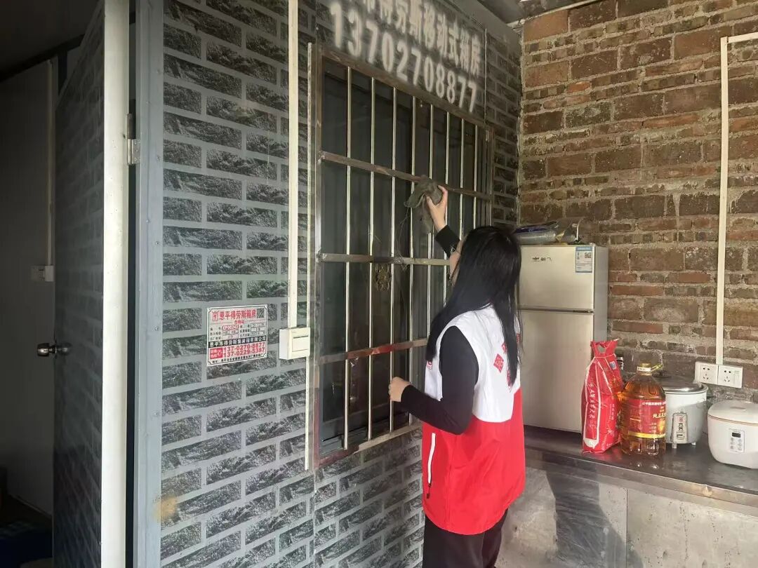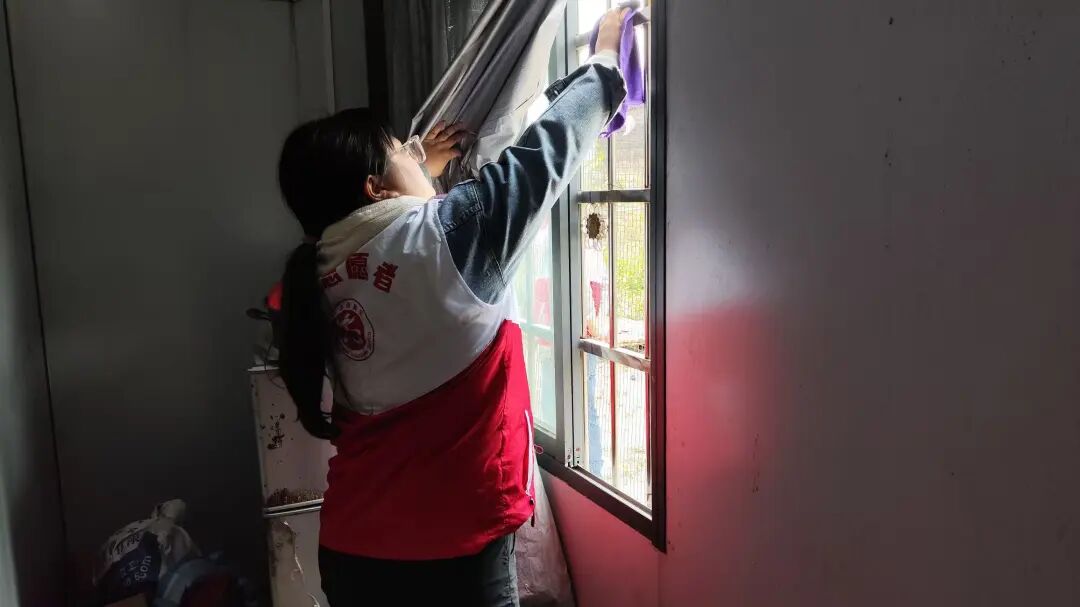 志愿者帮助老人们擦拭门窗