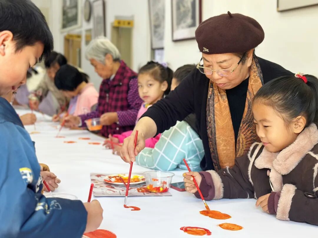 由区关工委举办的“银辉护苗”爱心托管班的孩子借着国画创作课程契机,围在老同志们身边,学着握笔、涂色,小心翼翼地在长卷上勾勒出小巧玲珑的柿子,一笔一画虽显稚嫩,却满是认真。
