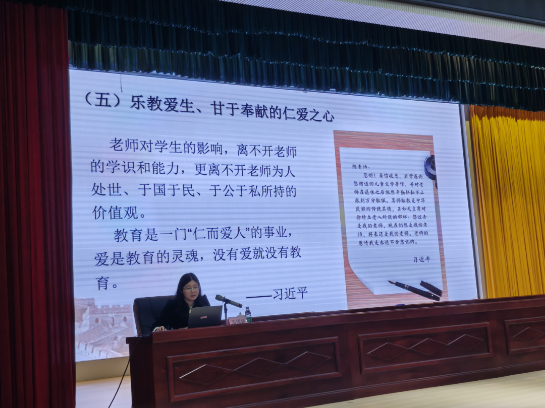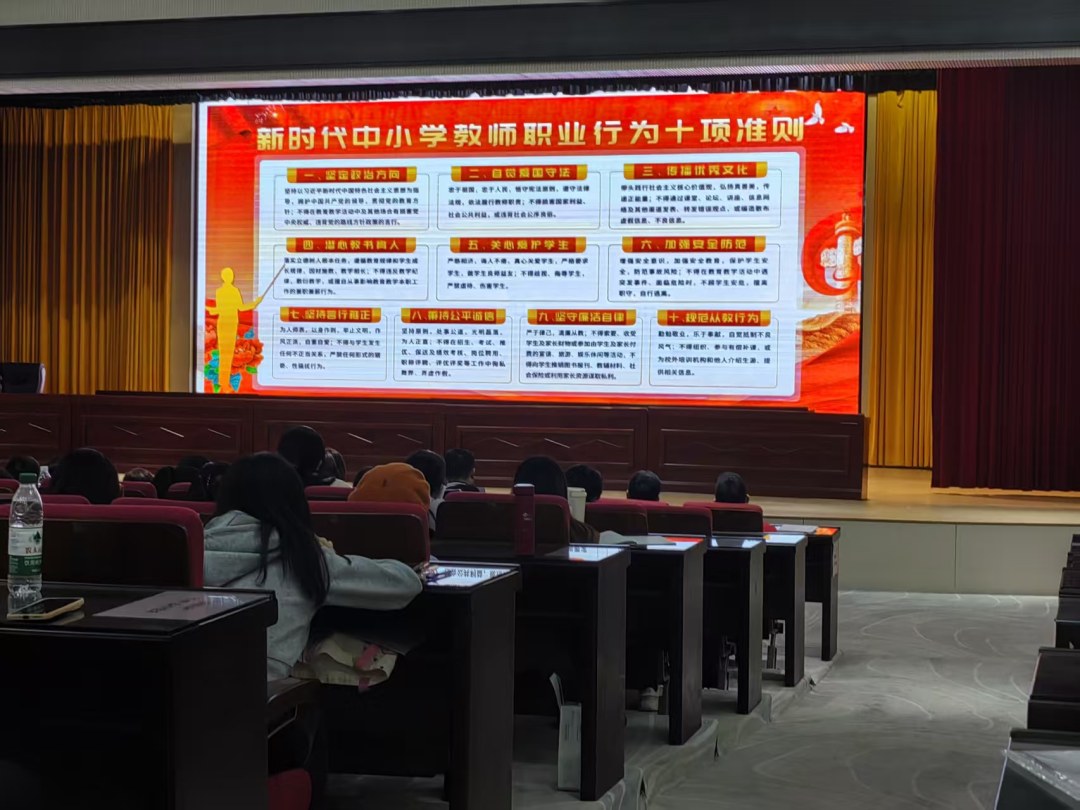 最后,邓嫣嫣寄语教师们要以《新时代中小学教师职业行为十项准则》为准绳,提高政治站位,强化责任担当;加强理论学习,坚持人民立场;立足本职工作,做到爱岗敬业;加强道德修养,发挥价值引导。