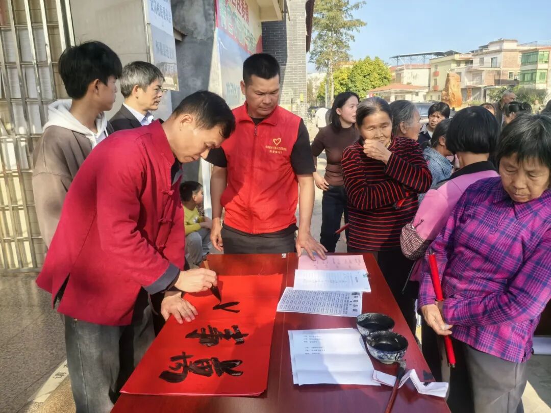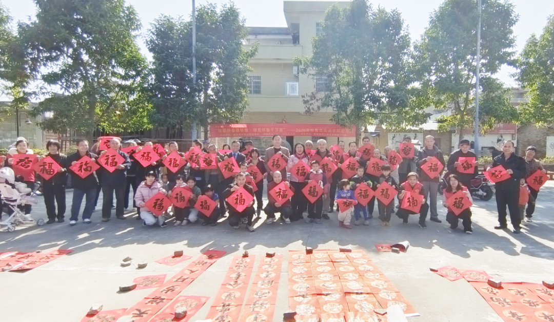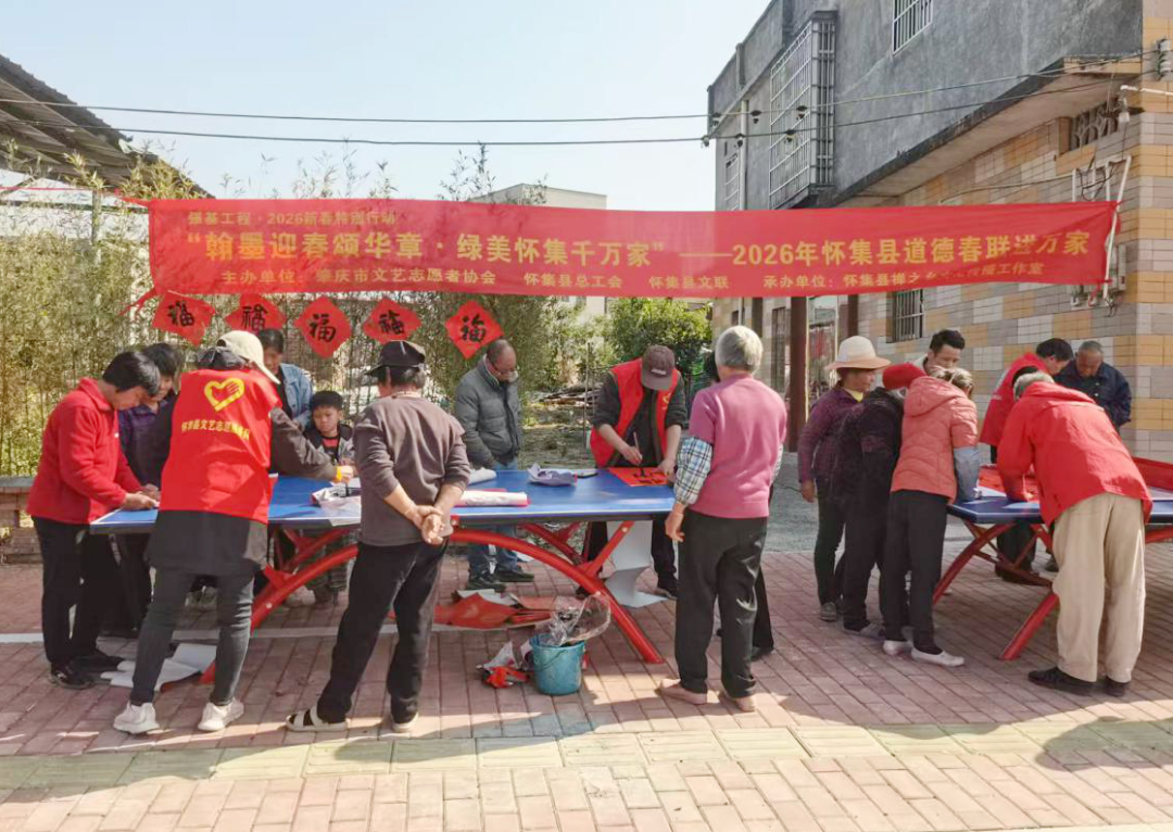 由肇庆市文艺志愿者协会、怀集县总工会、怀集县文联联合主办的“翰墨迎春颂华章·绿美怀集千万家”——2026年怀集县道德春联进万家活动,分别在大岗镇大钟村与集义村文体广场同步开展。