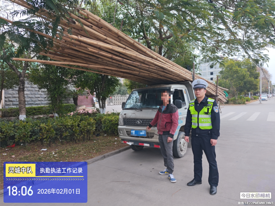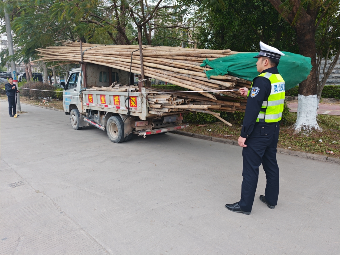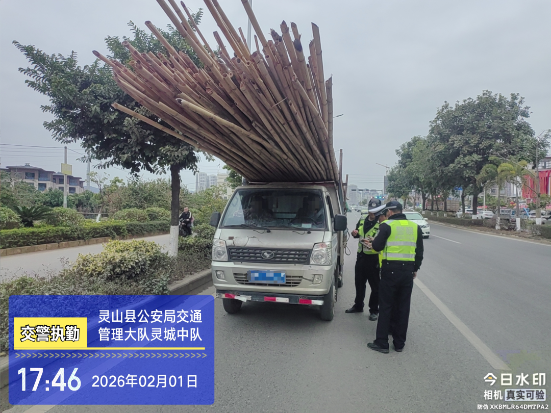 2月1日,钦州市灵山县公安局交通管理大队灵城中队民警在辖区江南路开展日常巡逻时,发现前方一辆轻型自卸货车装载的货物明显超出车体长度与高度,在行驶中晃晃悠悠,严重影响车辆稳定性,存在较大安全风险。见状,民警立即示意该车靠边停车接受检查。