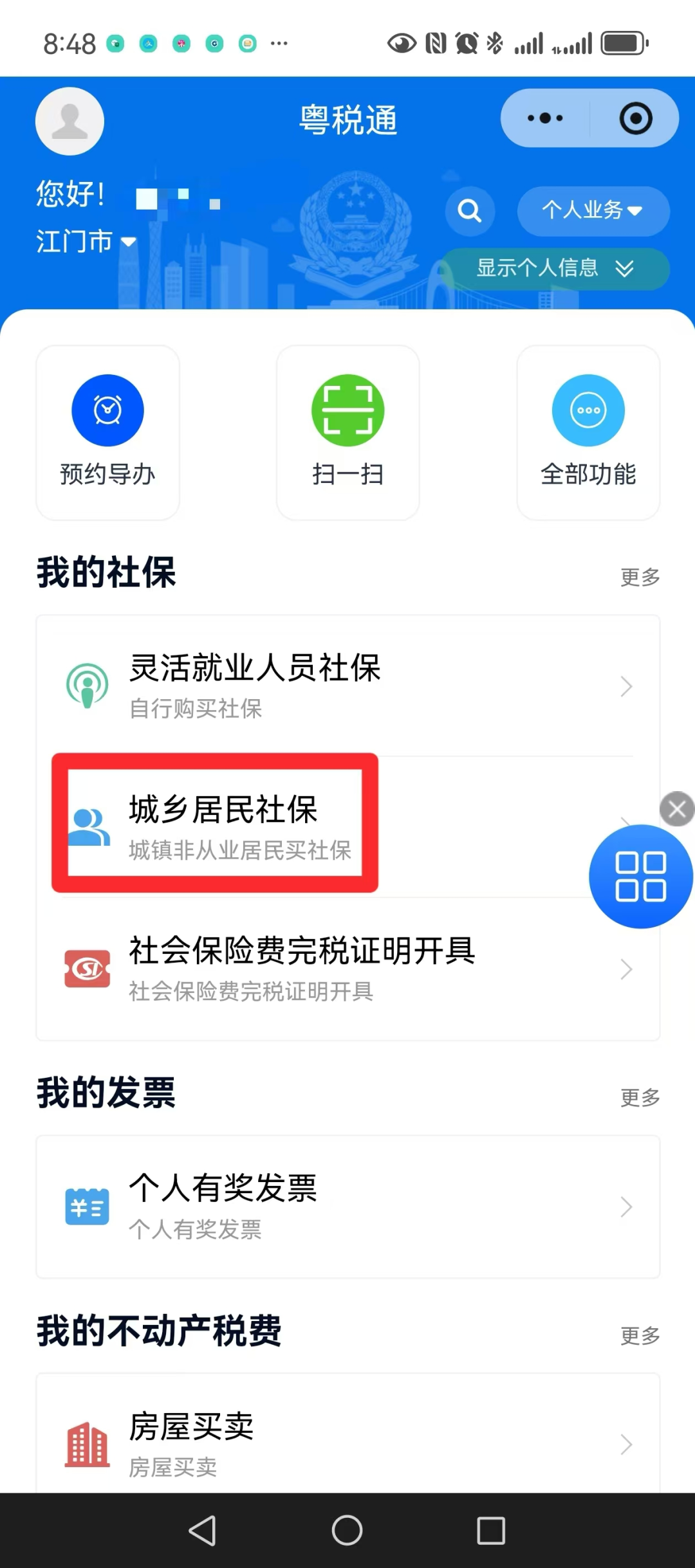 进入“粤省事”微信小程序,进入【社保·就业】,点击【城乡居民社保费清缴】跳转“粤税通”小程序,进入【城乡居民社保】选择【城乡居民社保费清缴】和【城乡居民缴费档次变更】即可办理社保费清缴及缴费档次变更。