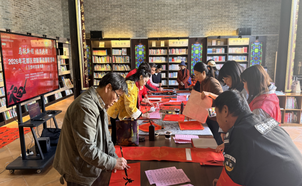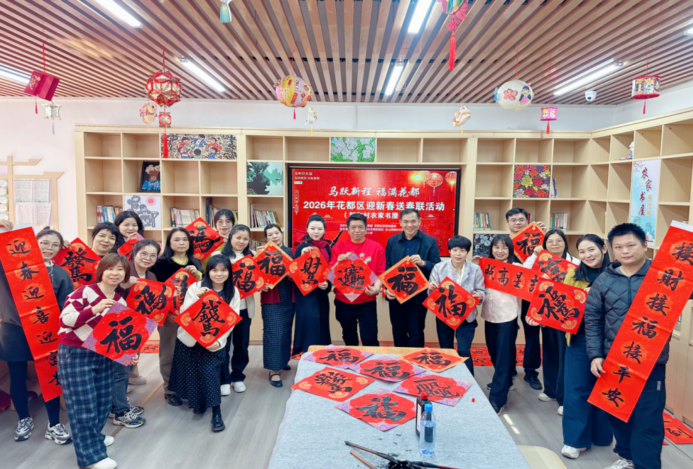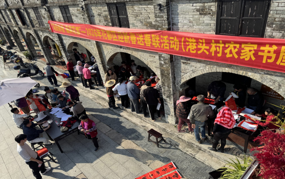 近日,由花都区委宣传部(区新闻出版局)主办的“马跃新程 福满花都”2026花都区迎新春送春联活动,陆续走进港头村、大东村、新和村、三华村藏书院村“花城书房·农家书屋”,为村民送上暖心的新春祝福。活动以传统笔墨承载新春祝福,将浓浓的年味儿送到家门口,让乡村文化阵地尽显温度与活力。