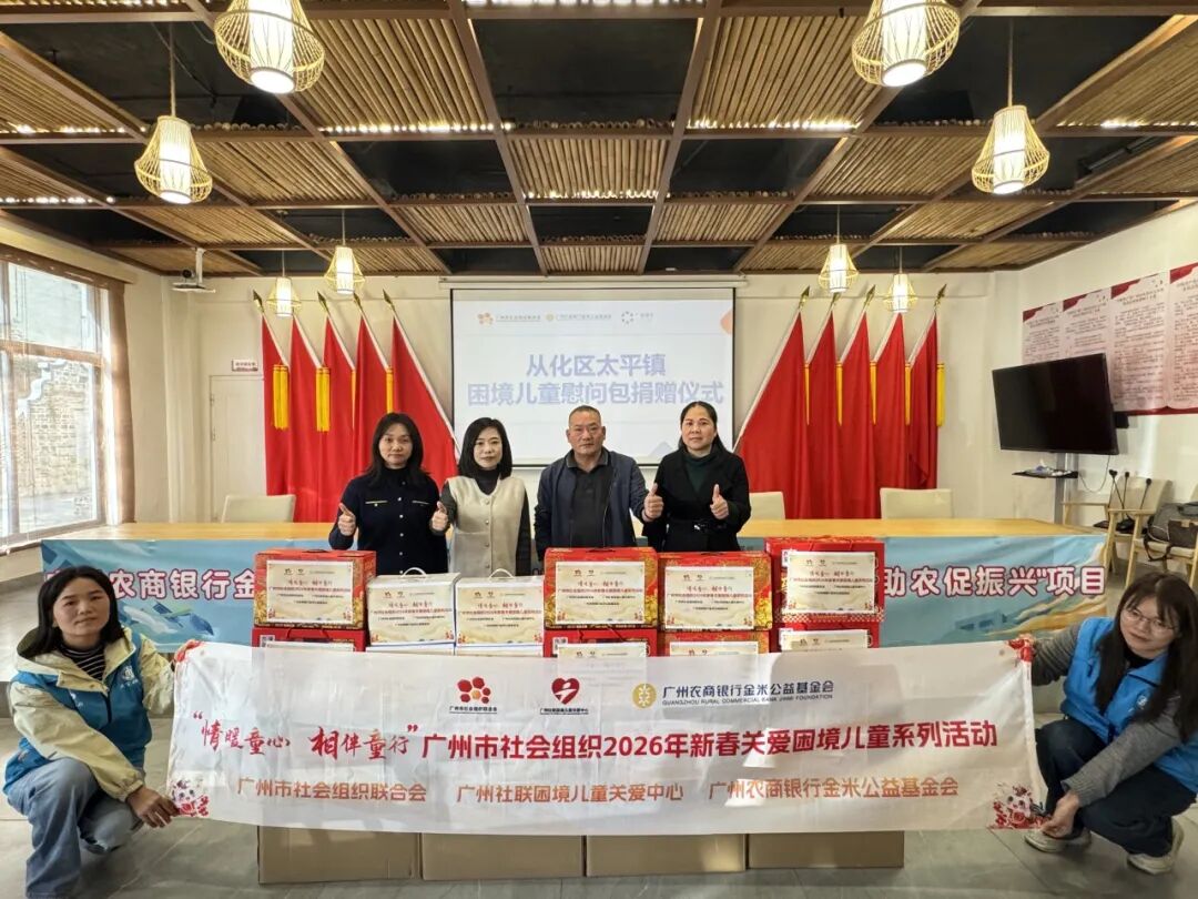 “情暖童心 相伴童行”广州市社会组织2026年新春关爱困境儿童系列活动在从化区开展。活动得到广州农商银行金米公益基金会的支持,捐赠约1.6万元物资用于慰问从化区100户困境儿童家庭。从化区太平镇人民政府副镇长马建佳,广州社联常务副秘书长、关爱中心秘书长庄秀英,广州农商银行从化支行经理黄嘉文,从化区未成年人保护中心主任邱志华,从化区太平镇人民政府公共服务干部专员李演昌出席捐赠仪式。捐赠仪式后,主办单位、捐赠方与有关部门代表走访慰问困难儿童家庭,送去新春祝福。
