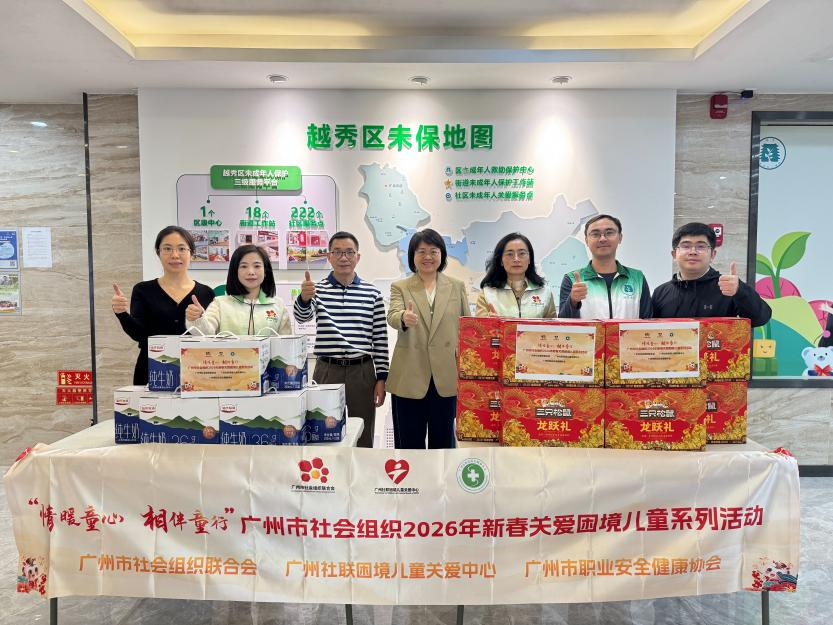 “情暖童心 相伴童行”广州市社会组织2026年新春关爱困境儿童系列活动在越秀区开展。活动得到广州市职业安全健康协会的支持,捐赠约1.1万元物资用于慰问越秀区50户困境儿童家庭。越秀区民政局党组成员、副局长黄丽英,广州社联常务副会长兼秘书长、关爱中心理事长焦杨,广州社联常务副秘书长、关爱中心秘书长庄秀英,市职业安全健康协会秘书长黄书保出席捐赠仪式。捐赠仪式后,主办单位、捐赠方与有关部门代表走访慰问困难儿童家庭,送去新春祝福。