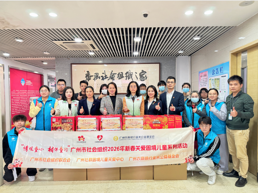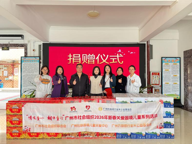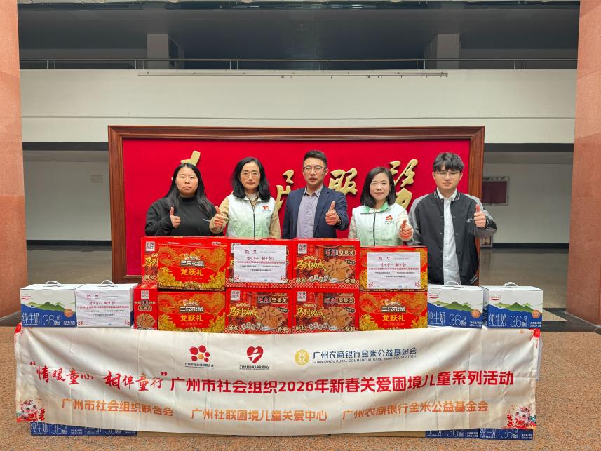 “情暖童心 相伴童行”广州市社会组织2026年新春关爱困境儿童系列活动在花都区开展。慰问得到广州农商银行金米公益基金会的支持,捐赠约1.6万元物资用于慰问花都区100户困境儿童家庭。花都区民政局党组成员、副局长祝志科,广州社联常务副会长兼秘书长、关爱中心理事长焦杨,广州农商银行花都支行经理马振锐,广州社联副秘书长王俊以及花都区未成年人救助保护中心副主任邓秋怡出席捐赠仪式。捐赠仪式后,主办单位与有关部门代表就花都困境儿童的整体状况进行交流,共同探讨困境儿童关爱新思路。