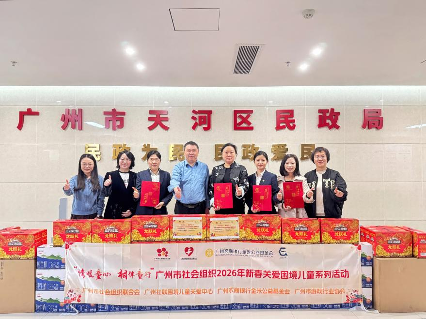 “情暖童心 相伴童行”广州市社会组织2026年新春关爱困境儿童系列活动在天河区开展。活动得到广州农商银行金米公益基金会和广州市游戏行业协会的支持,捐赠约1.98万元物资用于慰问天河180户困境儿童家庭。天河区民政局党组成员、副局长蒋孝华,广州社联常务副秘书长、关爱中心秘书长庄秀英,市游戏行业协会会长王娟,广州农商银行体育东路支行行长朱娜、副行长余纳出席捐赠仪式。捐赠仪式后,主办单位、捐赠方与有关部门代表走访慰问困难儿童家庭,送去新春祝福。