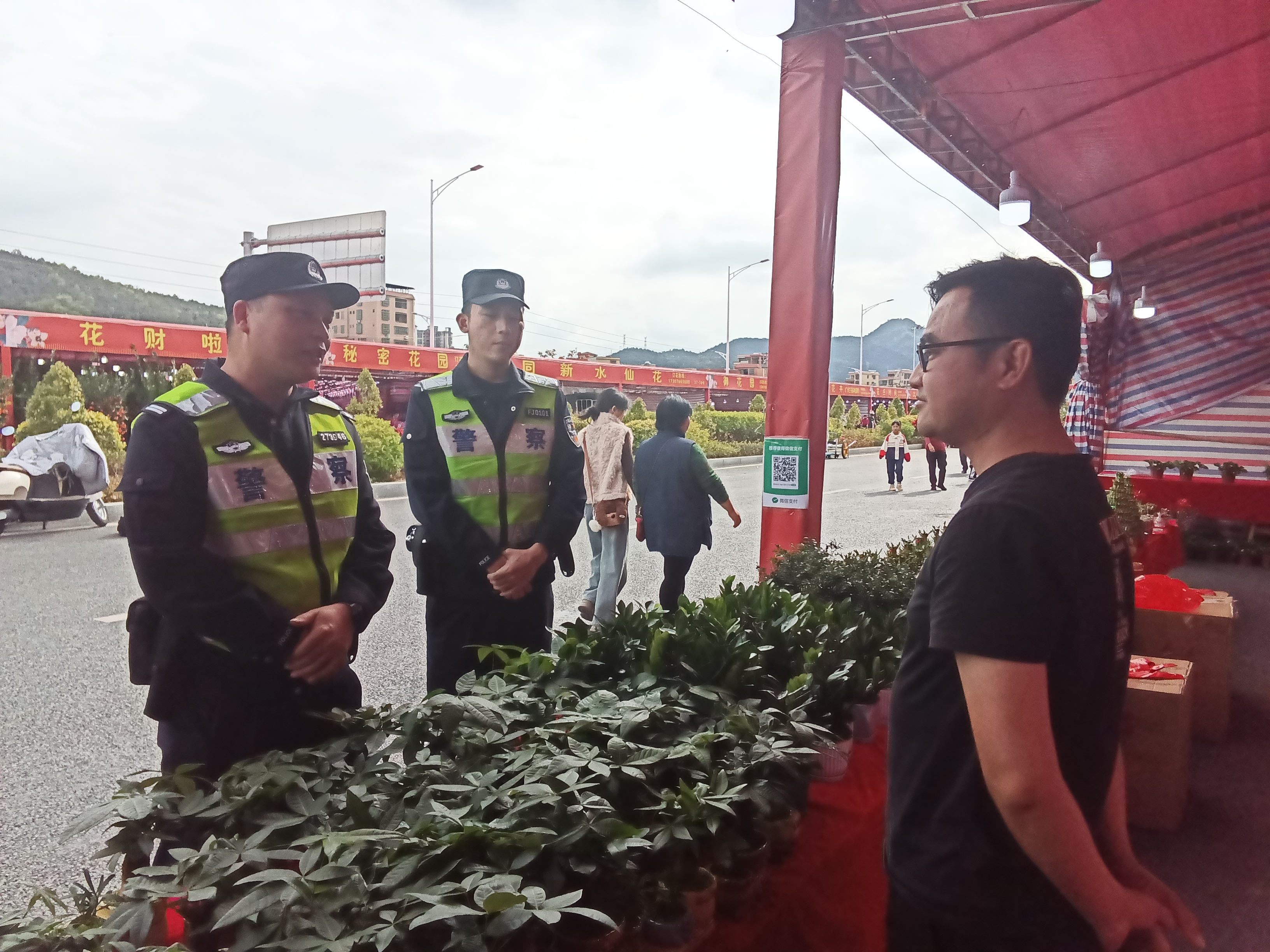 “今年经营环境如何?有什么需要请及时通知,我们会第一时间到场提供帮助。”花市现场,正在巡逻的天马派出所民警陈国明正与一家商铺经营者聊天。据他介绍,今年花市安保创新采用“无人机巡航+地面步巡”相结合的模式,实现“空地一体”全方位防控。派出所民警全天候在岗,不仅加强花市内部及周边步巡,还实时关注市场与店铺动态,确保各类风险隐患早发现、早化解,全力营造安心、放心、舒心的购花游玩环境。