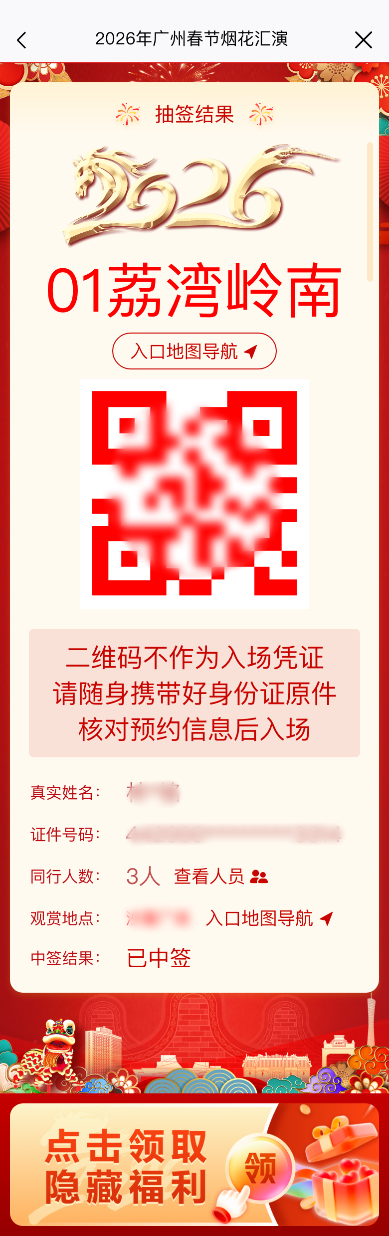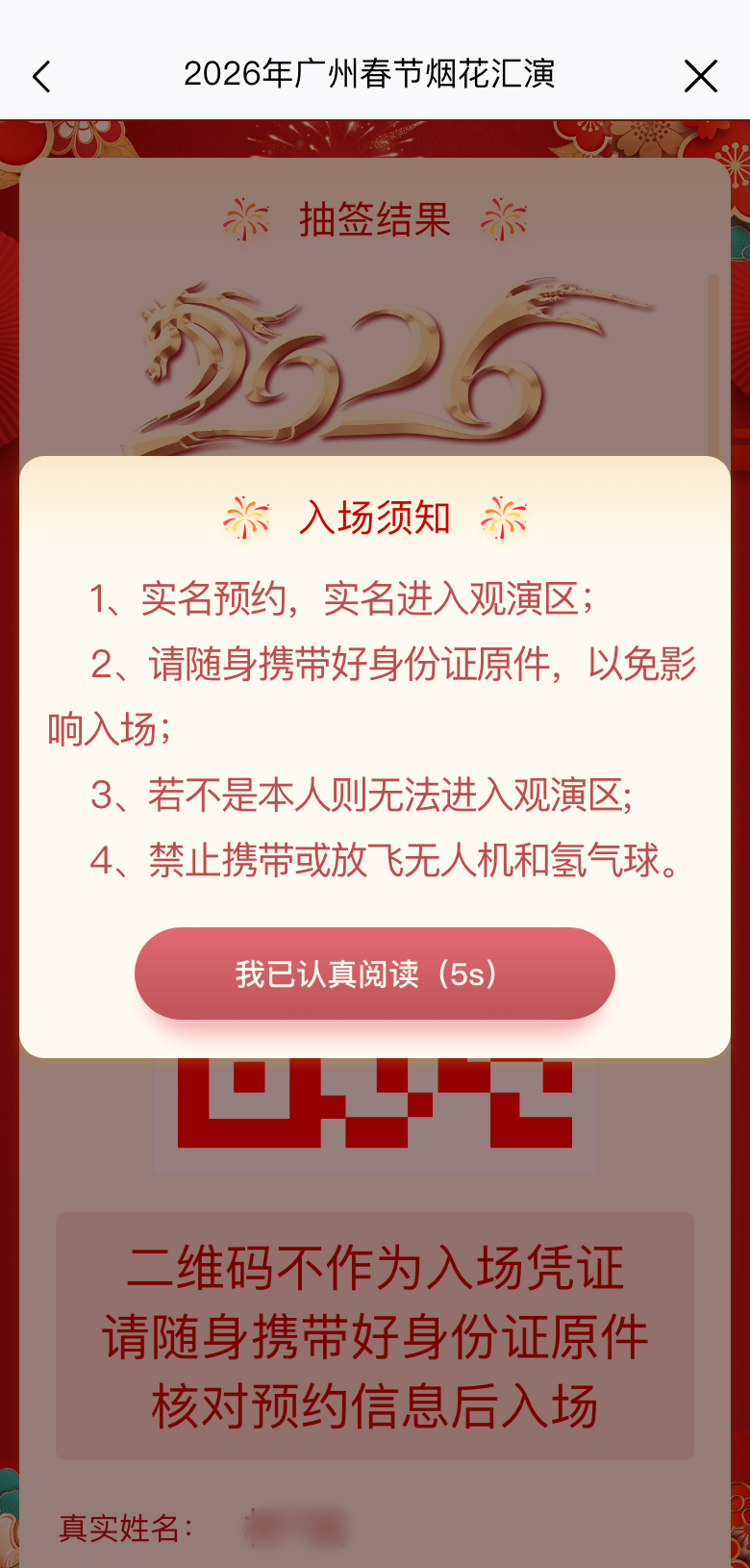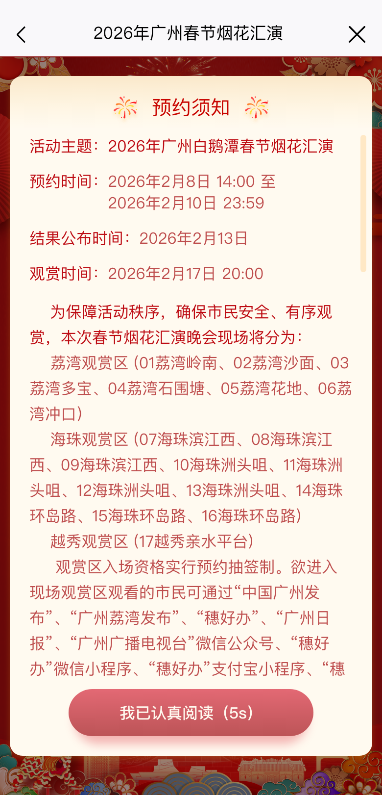 本次春节烟花汇演观赏区入场资格实行预约单抽签机制。