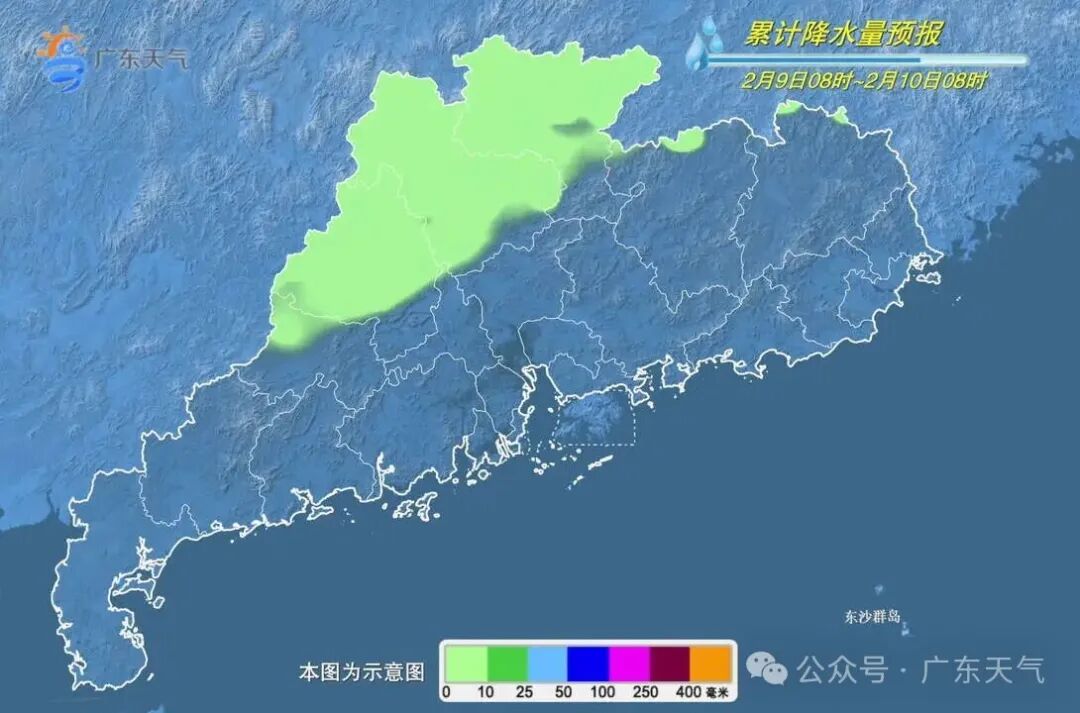 2月9日08时到10日08时,贵州东部、广西北部、湖南、江西、福建北部多云到阴天,有小雨,贵州中西部、广西中南部、福建中南部、海南多云。