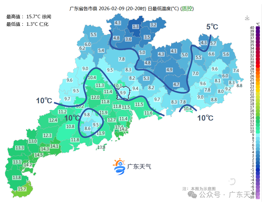 本轮冷空气的最冷大招,如期放在了今天(9日)早晨,韶关、河源、梅州等粤北市县最低气温直接跌破5℃,中东部大多不足10℃。另外,韶关、清远、肇庆北部今早受中层波动影响还飘起了小雨,阴冷的感觉还是很明显的。