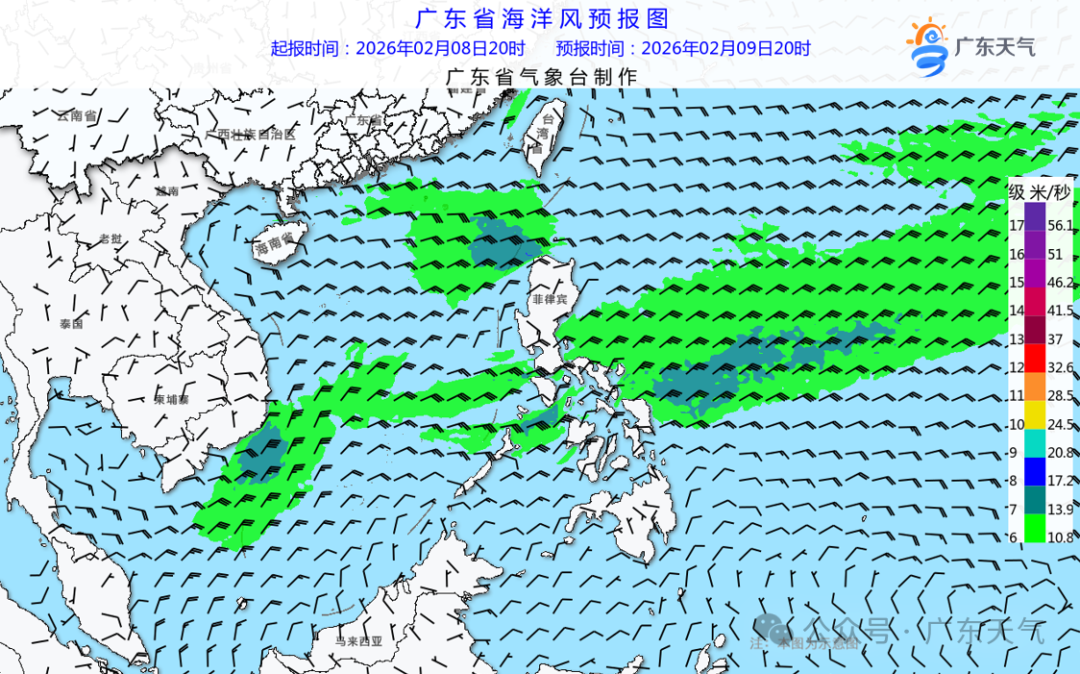 9日,粤东海面东北风6~7级阵风8级,中西部海面东北到东风5~6级阵风7级,海面风力大,注意海上作业和交通安全。10日我省海面风力减弱到5级阵风6级。